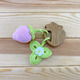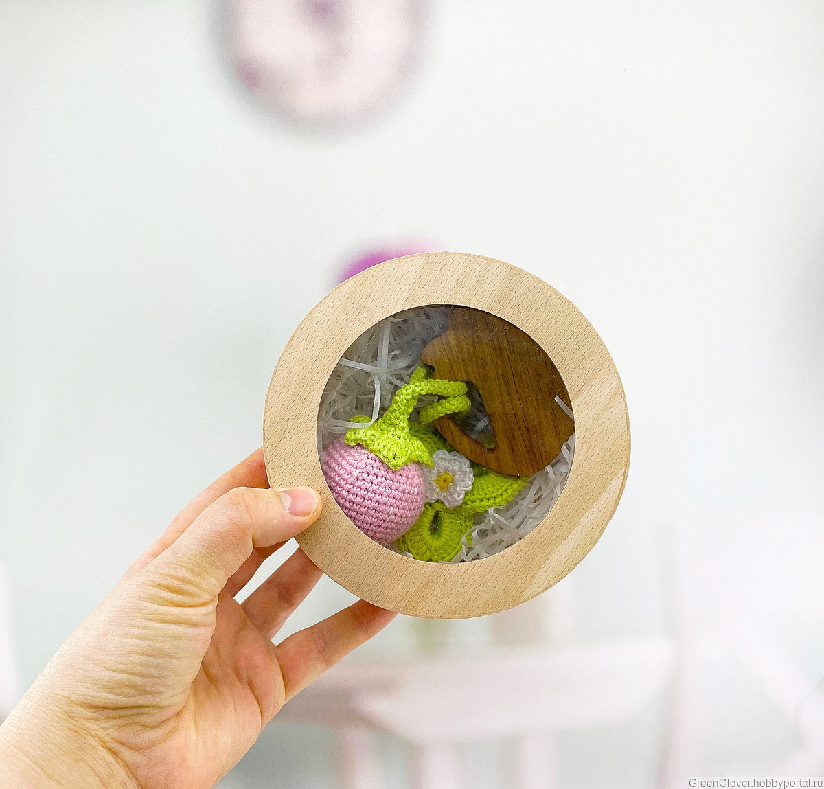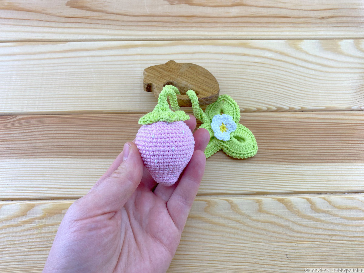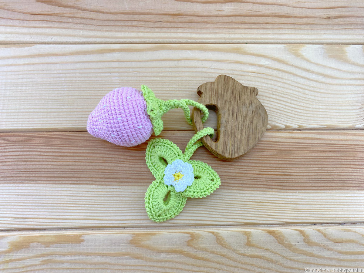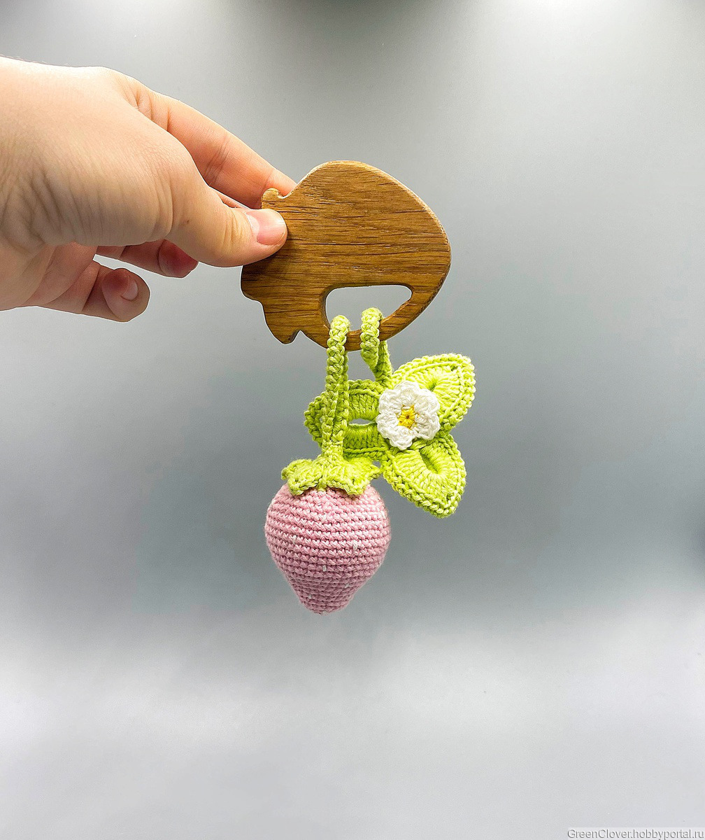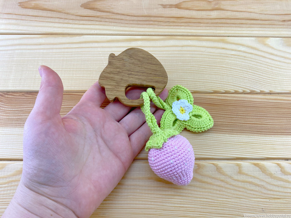 В игрушке использована деревянная фигурка - клубничка (дуб), ёжик (бук) и зайчик (бук). Фигурка послужит отличным грызунком в период прорезывания зубок)
