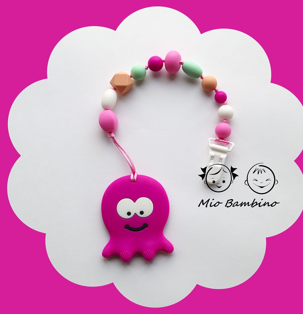 Стильный аксессуар для мамы, можно всегда носить на шее и давать малышу в очереди, во время занятиями домашними делами или на прогулке. Грызунки крепятся "крокодильчиком" к одежде, игрушку можно поменять или убрать вовсе, и у малыша будет стильный держатель для пустышки! Грызунок не упадет на землю, и не испачкается в самый неподходящий момент!