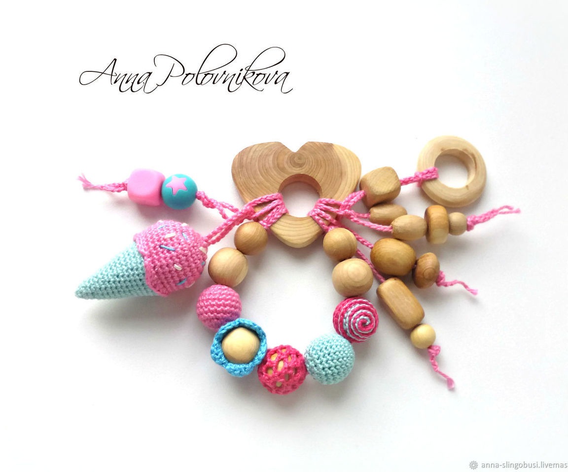Деревянный грызунок - то, что нужно режущихся зубиков и чешущихся десенок. Мороженка гремит, а множество деревянных элементов разных форм и различная обвязка бусин способствуют развитию мелкой моторики крошки.