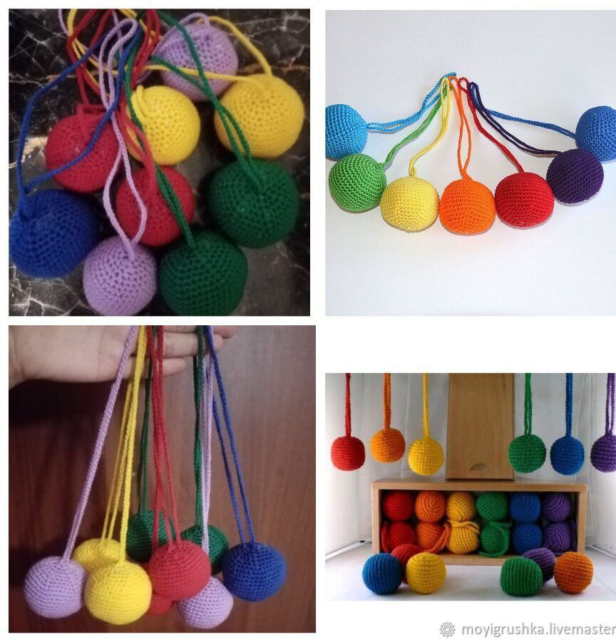 Первый дар Фребеля – это текстильные мячики на ниточке всех цветов радуги и белого цвета (один красный мячик, один оранжевый мячик, один желтый мячик и так далее). Мячик держат за веревочку и показывают ребенку разные виды движений с ним: направо-налево, вверх-вниз, по кругу, колеблющиеся движения. Игры с мячиком учат ребенка различать цвета и ориентироваться в пространстве.