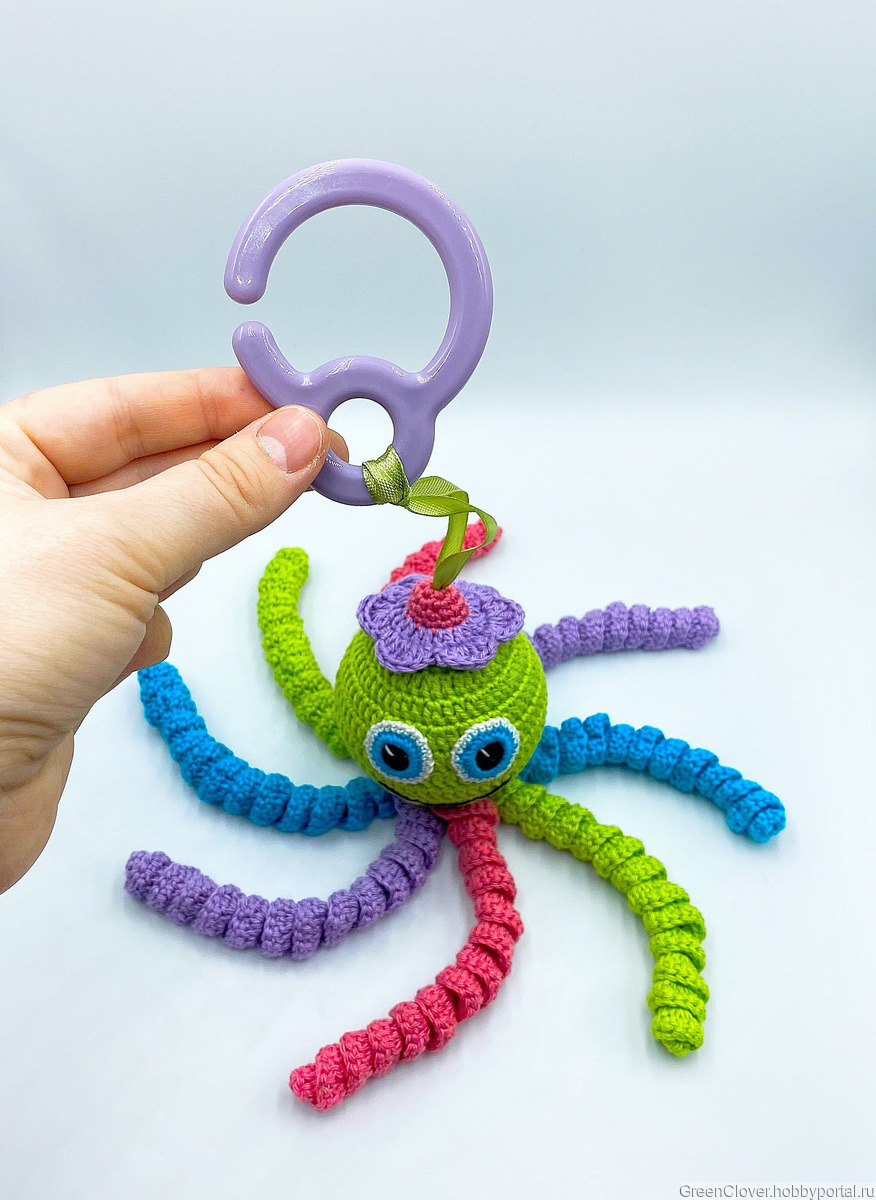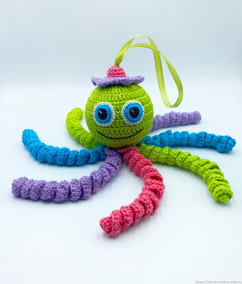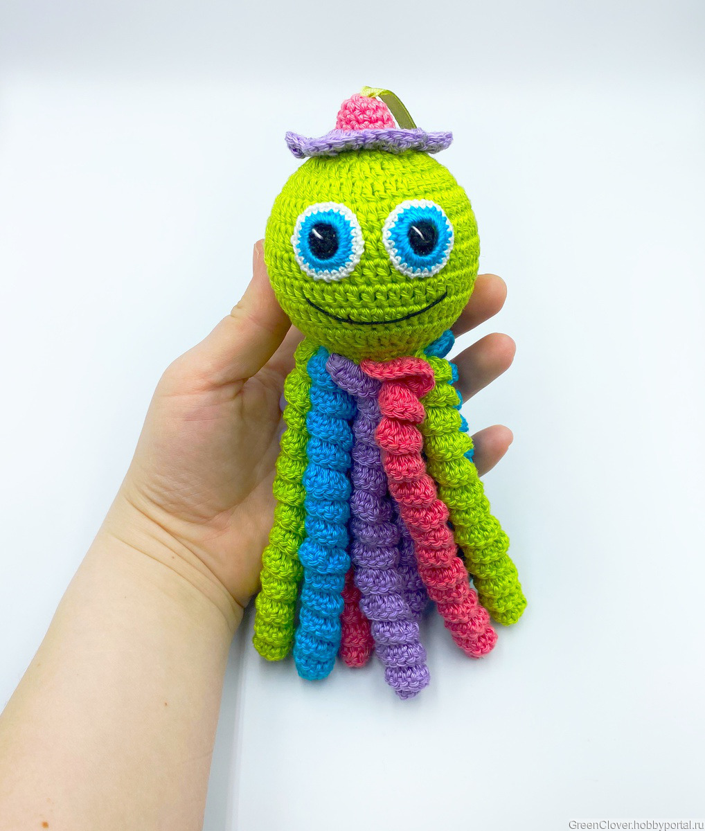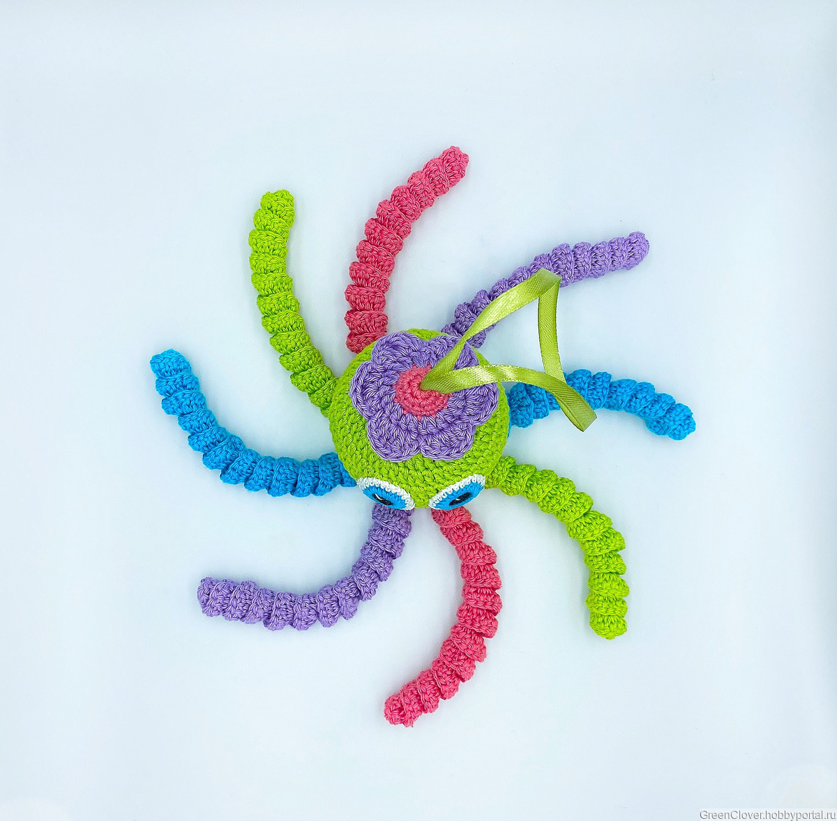 Осьминожек связан из 100% хлопка. Все детали очень надежно закреплены и безопасны для ребенка, глазки связаны и пришиты.