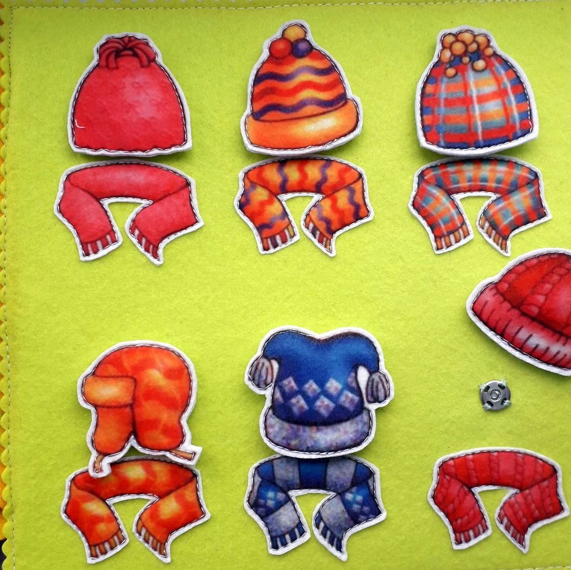 3 страничка - "найди пару" - нужно к шарфику подобрать шапочку,чтоб получился комплект, шапочки все на кнопках.