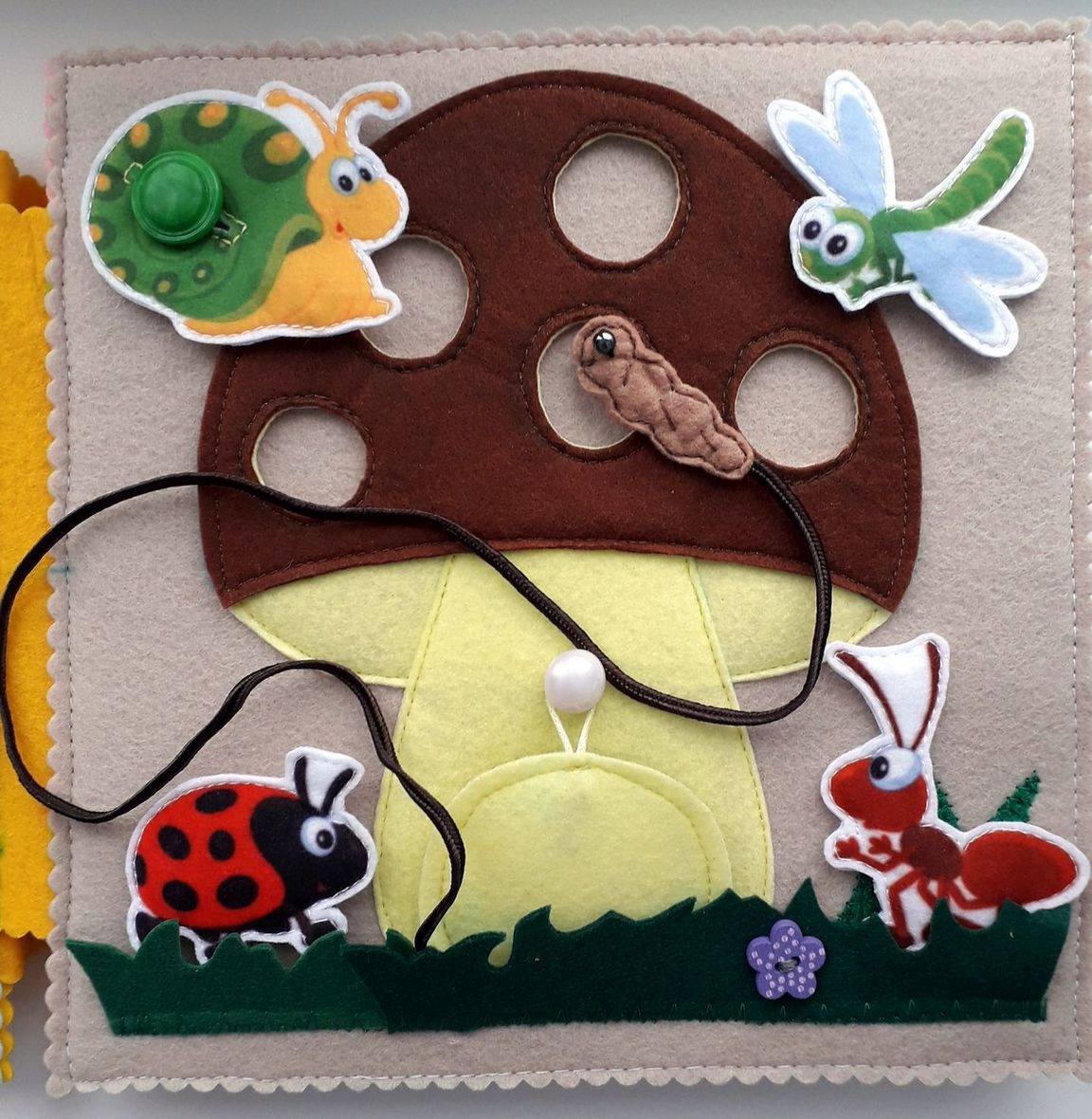 5 страница - шнуровка с грибочком, насекомые на липучке, магнитной кнопке и пуговке.