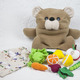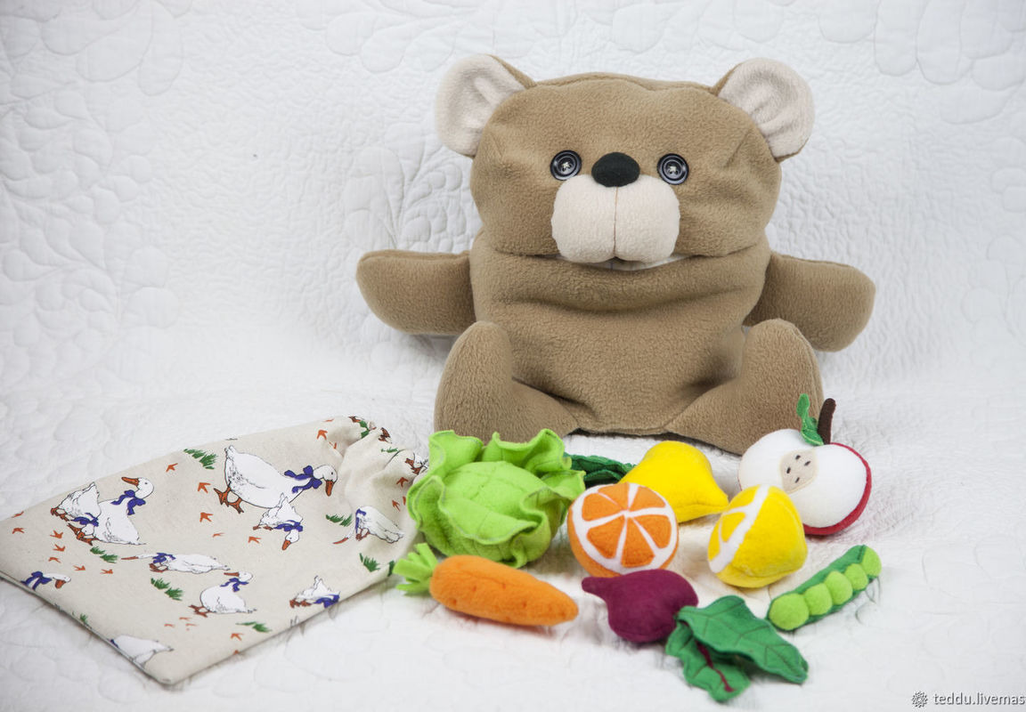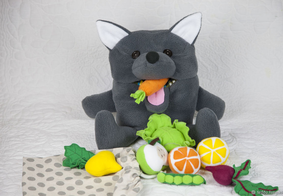 Котика можно кормить, я для игры шью овощи, фрукты и ягоды.Во время игры можно изучать цвета, размер, попросить например накормить котика овощами или фруктами, можно считать сколько съел котик к примеру ягод). Читать стишки про котика, показывать части тела.