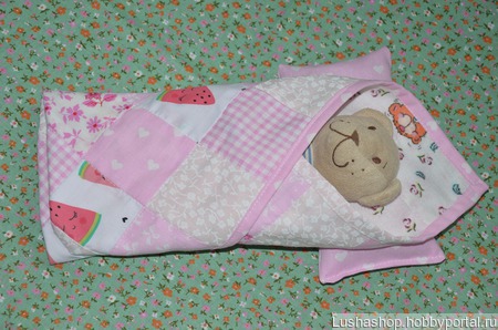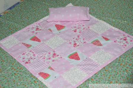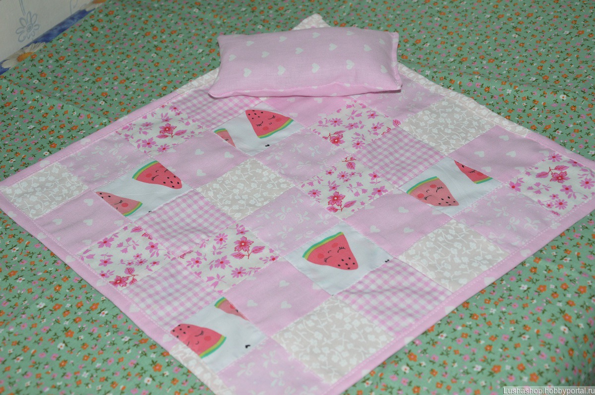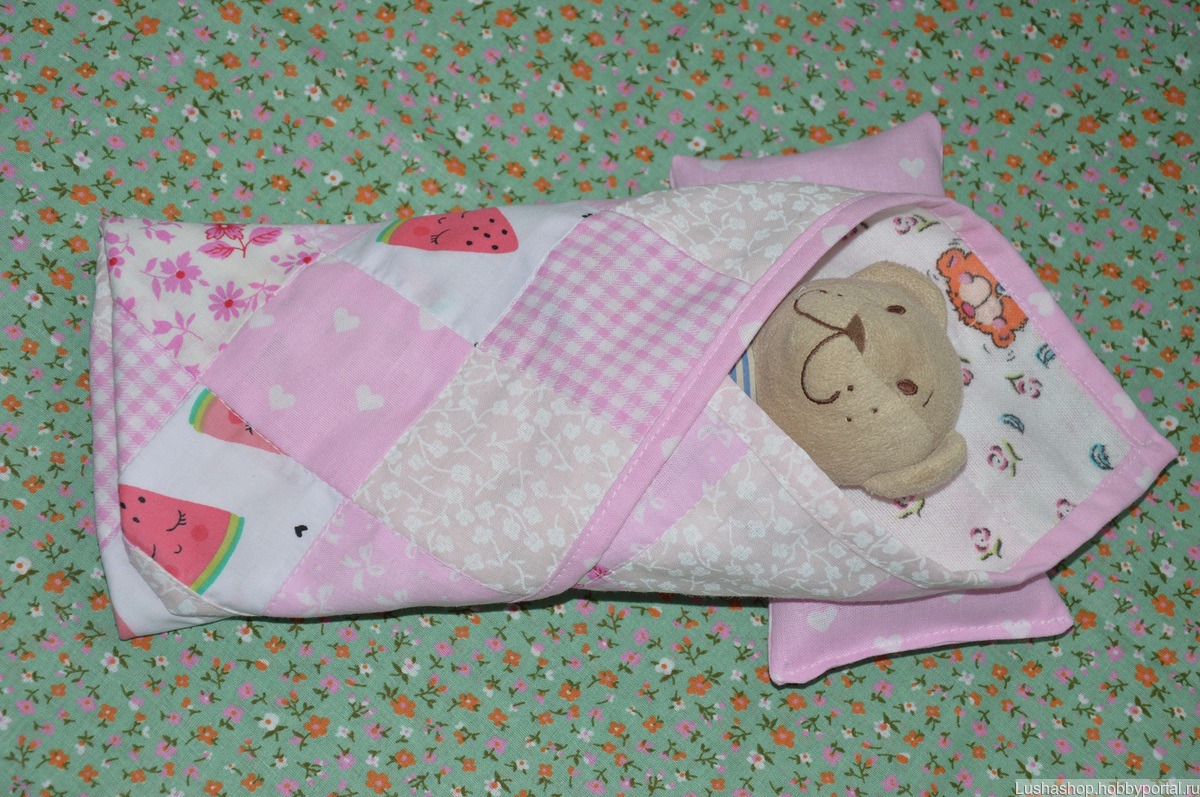Верх кукольного одеяла сшит из хлопка в лоскутной технике, низ - из мягкой фланели, простегано на машине в раскол швов, окантовано тканью в тон одеяла. Отдельно сшита подушка, наполнена холлофайбером. Сделаю на заказ в любой цветовой гамме по Вашим размерам.