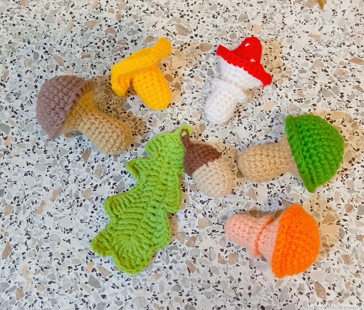 В набор входит 5 грибов (масленок, мухомор, сыроежка, подберёзовик, лисичка), листок дуба с желудем.