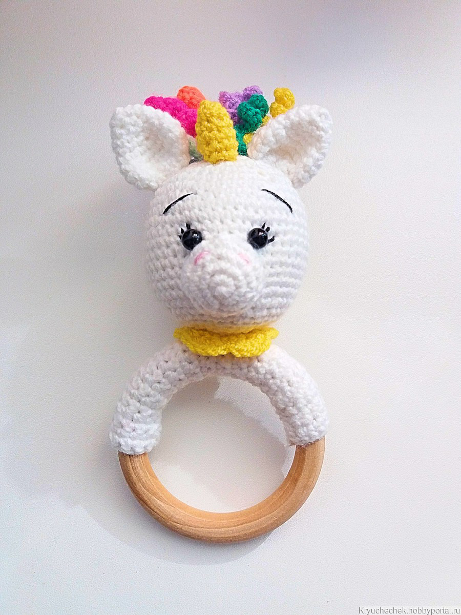 Единорожка связана на деревянном кольце. Состав 100% хлопковая пряжа. Внутри головы погремушка.