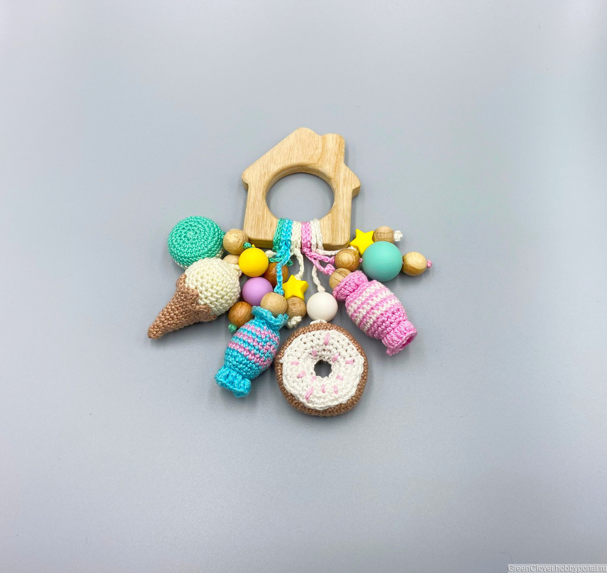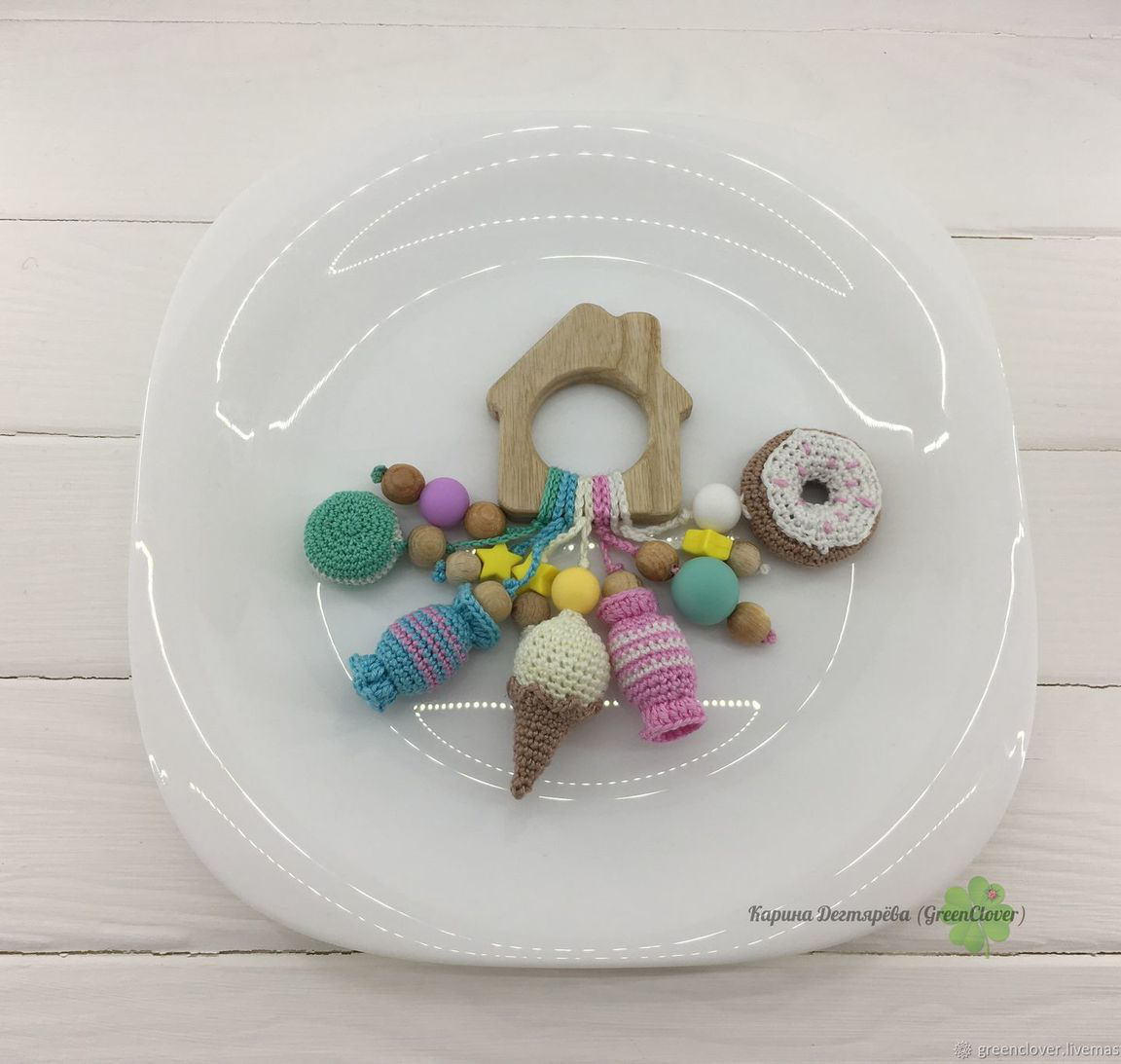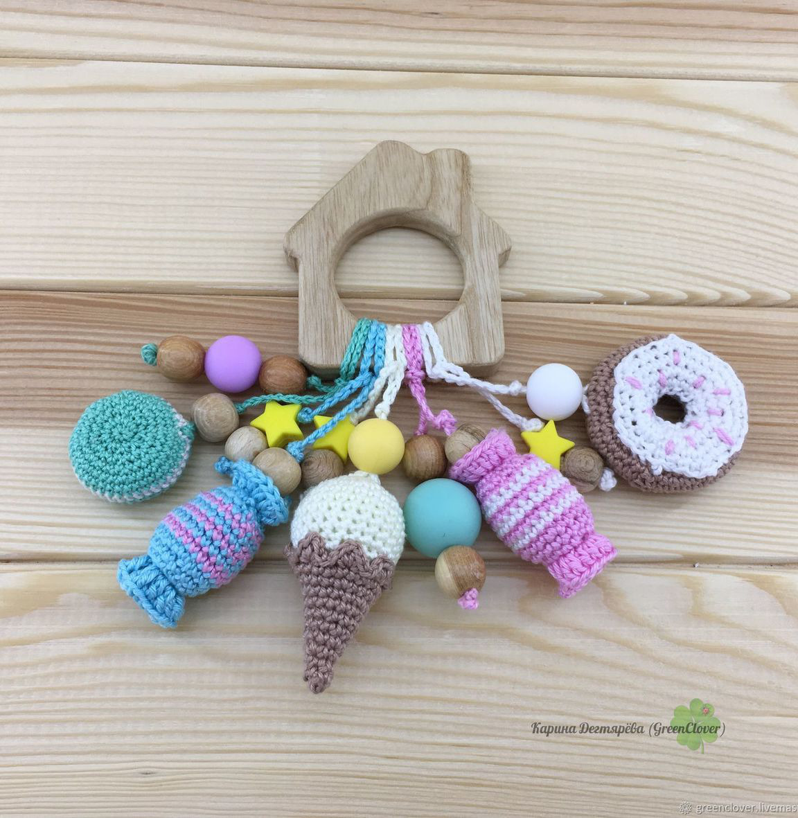 развивающая игрушка, прорезыватель, подарок новорожденному, подарок на рождение, погремушка, грызунок, для новорожденного, комбинированный, развитие мелкой моторики, подарок маме и малышу, первая игрушка, погремушка вязаная, подарок слингомаме, вязаные сладости, прорезыватель для зубов, грызунок можжевеловый, грызунок из дерева, грызунок деревянный, именной прорезыватель, прорезыватель деревянный