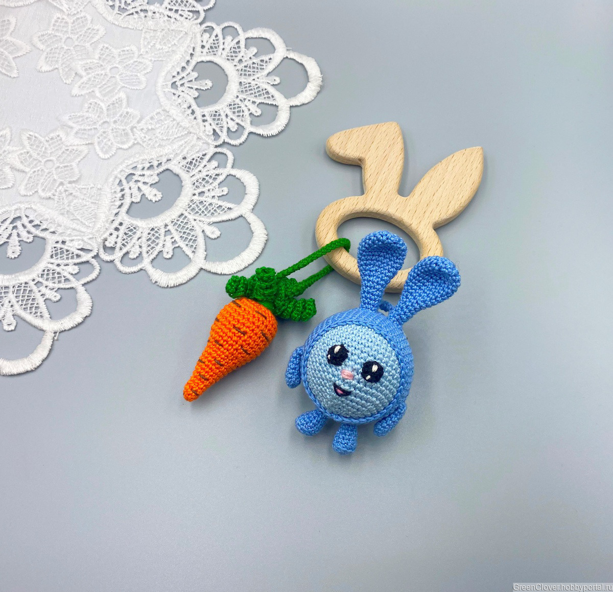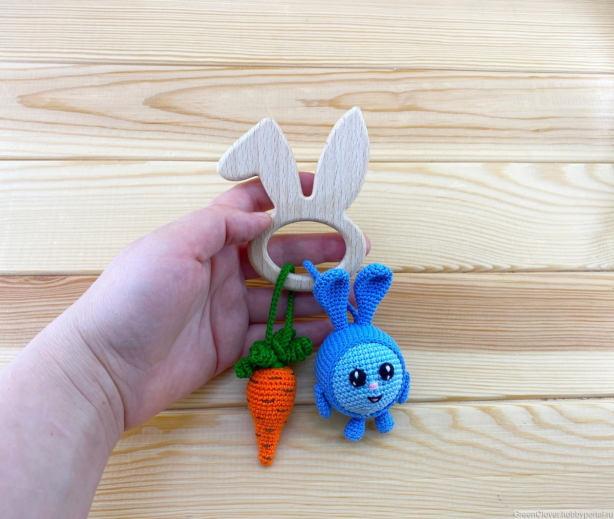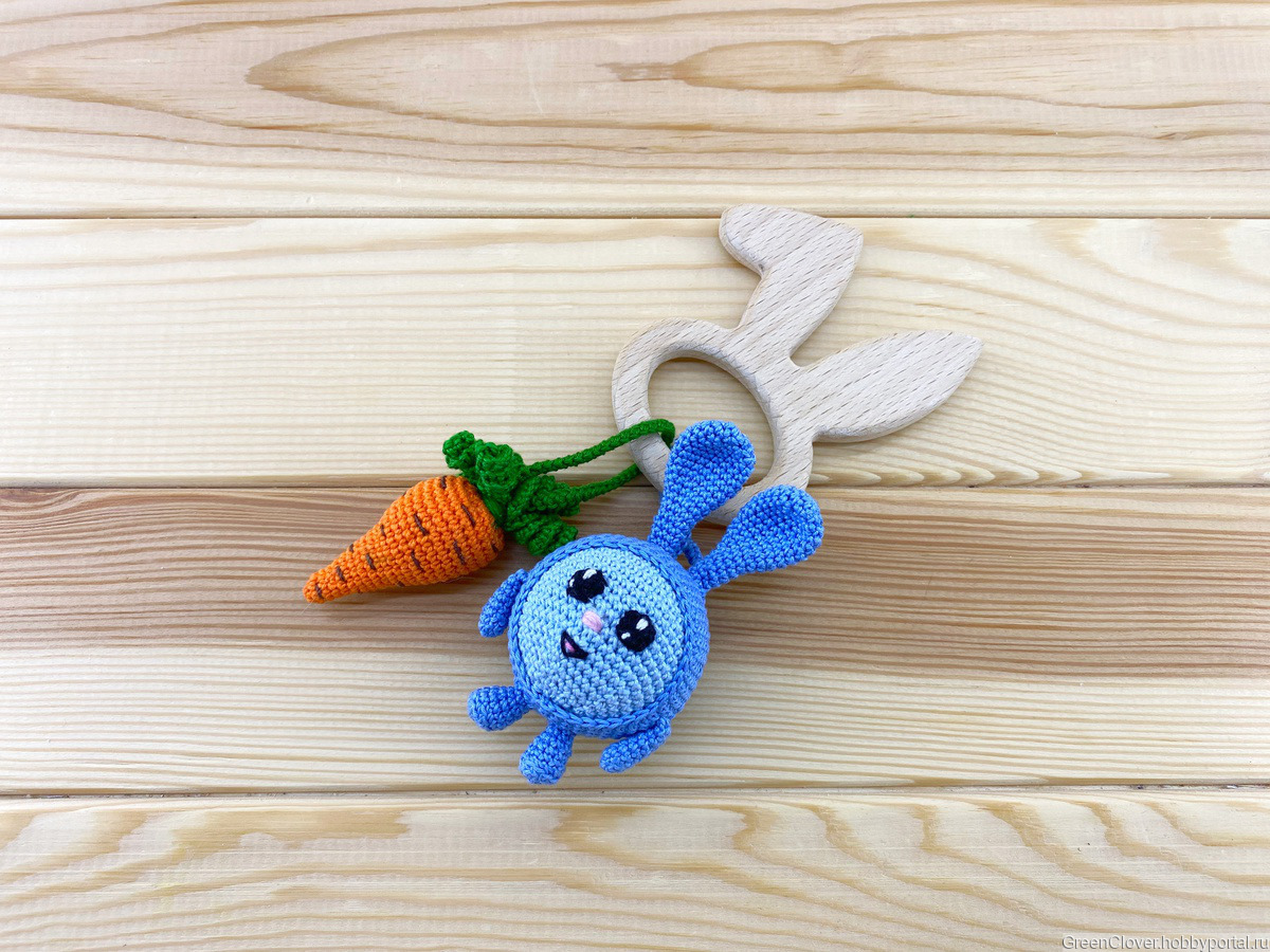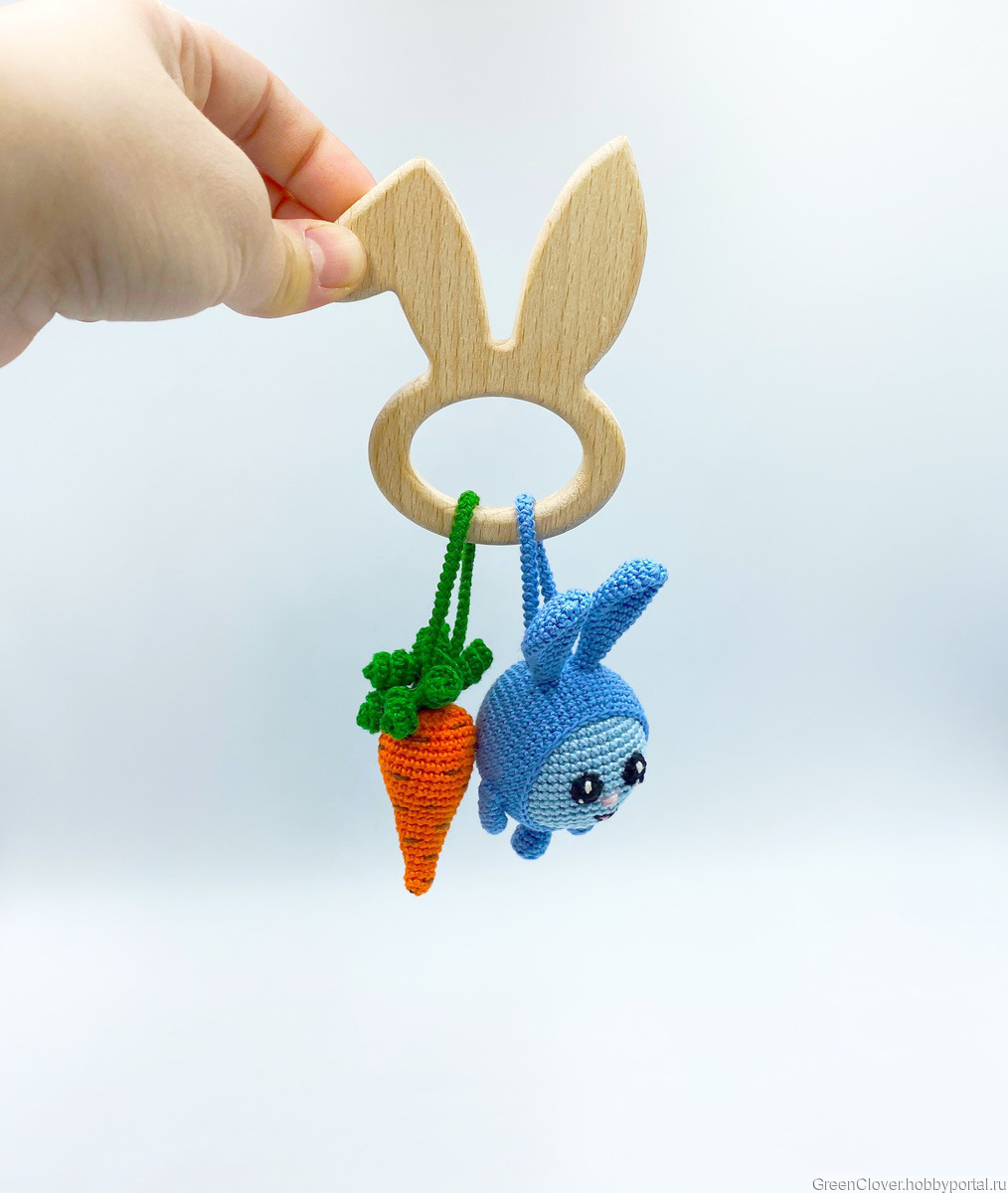 В игрушке использована деревянная фигурка - клубничка (дуб), ёжик (бук) и зайчик (бук). Фигурка послужит отличным грызунком в период прорезывания зубок)