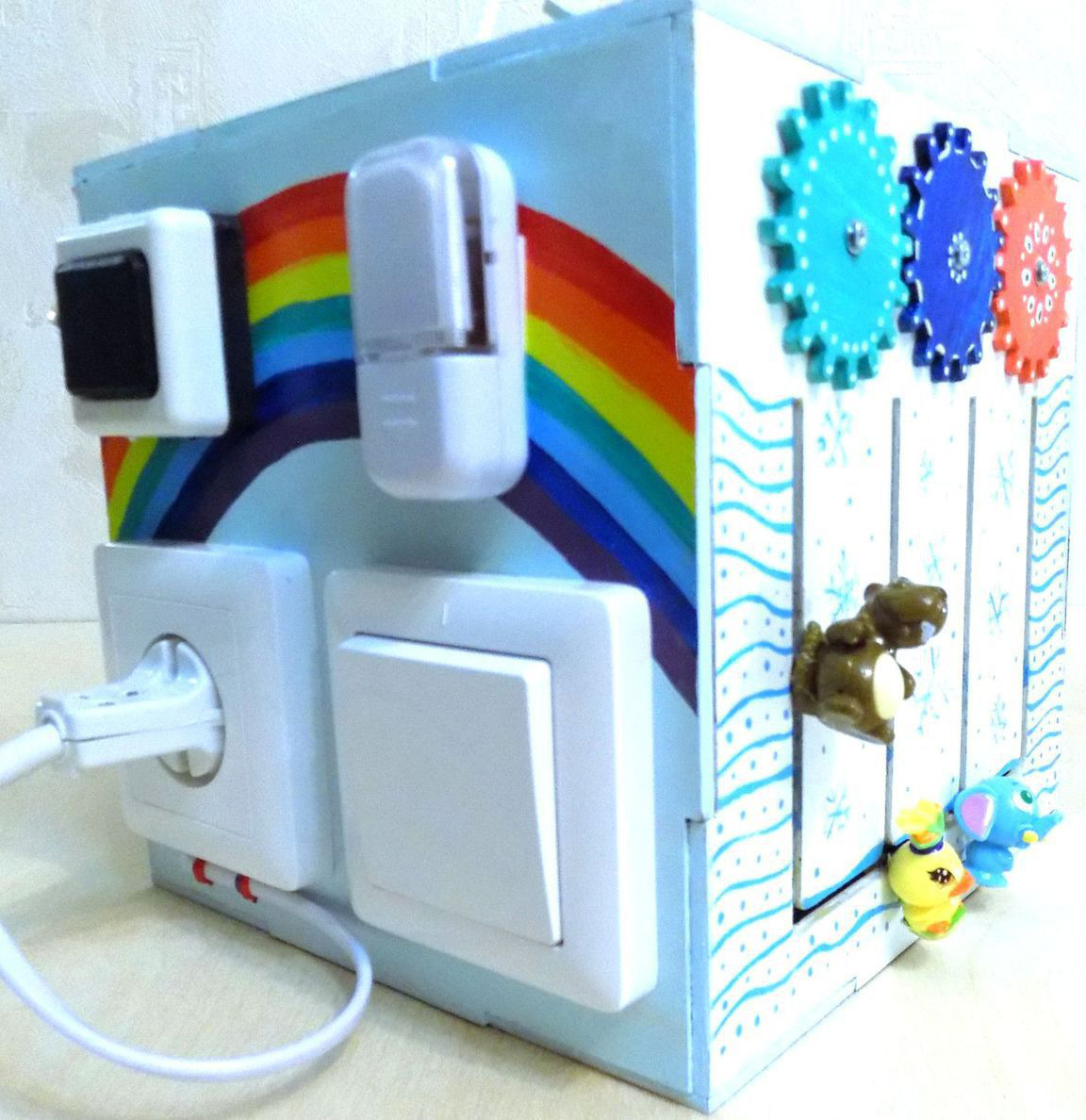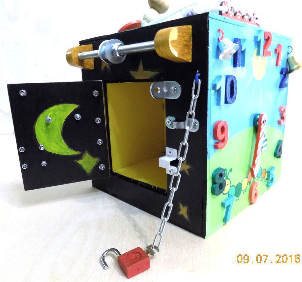 Яркий необычный развивающая игрушка в виде куба для мелкой моторики. Очень удобный размер. Есть ручка для переноса с бусинами, дверца на щеколде, задвижке, и замочке с ключиком, с местом для хранения, часы, колокольчики, геометрические вкладыши, шнуровка, шпилька с шайбами и болтами, шестеренки, передвигалки, светильник включается при нажатии кнопки звонка и выключателем.