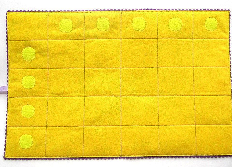 Игровое поле разделено на прямоугольники. Клетки верхней строки и левого столбика служат для крепления карточек с заданиями. В этих клеточках пришита мягкая часть липучки. На карточки с заданиями пришита жесткая часть липучки.