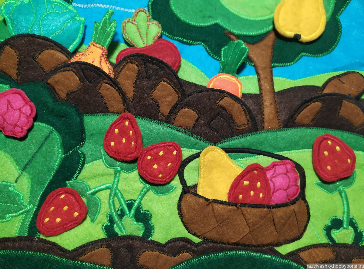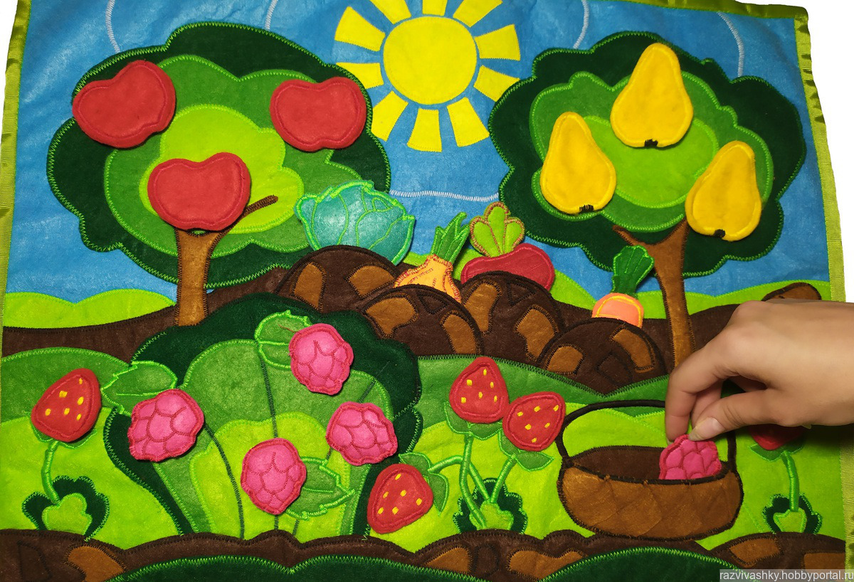 Игровой планшет из фетра 40х55 см, 21 деталь. Учим с малышом фрукты, овощи, ягоды, кто как растет. Собирая урожай в корзинку учимся считаем до 3х, до 5ти. Развиваем внимательность, усидчивость, мелкую моторику. Липучки на детальках и кармашки позволяют располагать игру как горизонтально, так и вертикально.