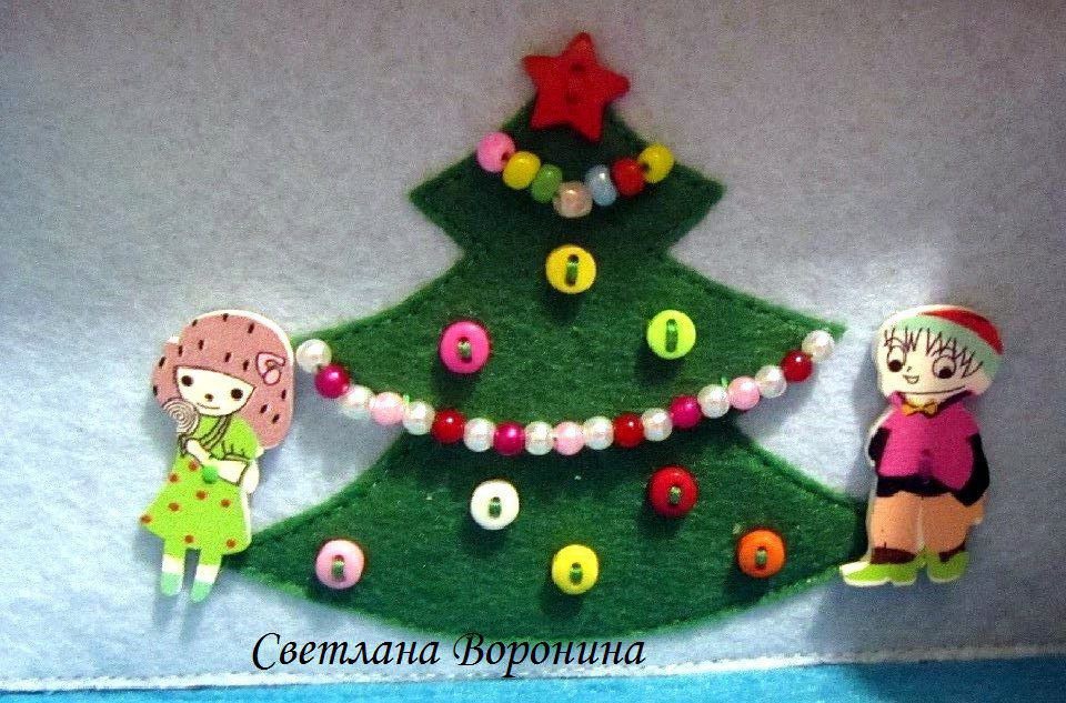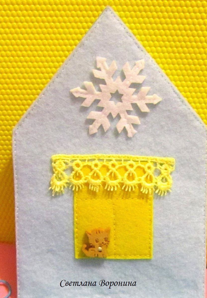 Внутри на одной стенке домика - нарядная елочка. Рядом с елочкой девочка и мальчик. На второй стене - окошка, на котором сидит симпатичный котенок. На третьей стене карман с прозрачной стенкой. В карман можно вставлять картинки или фотографии.