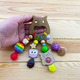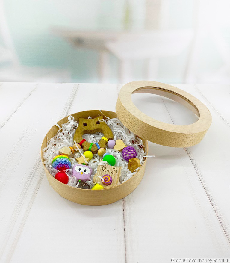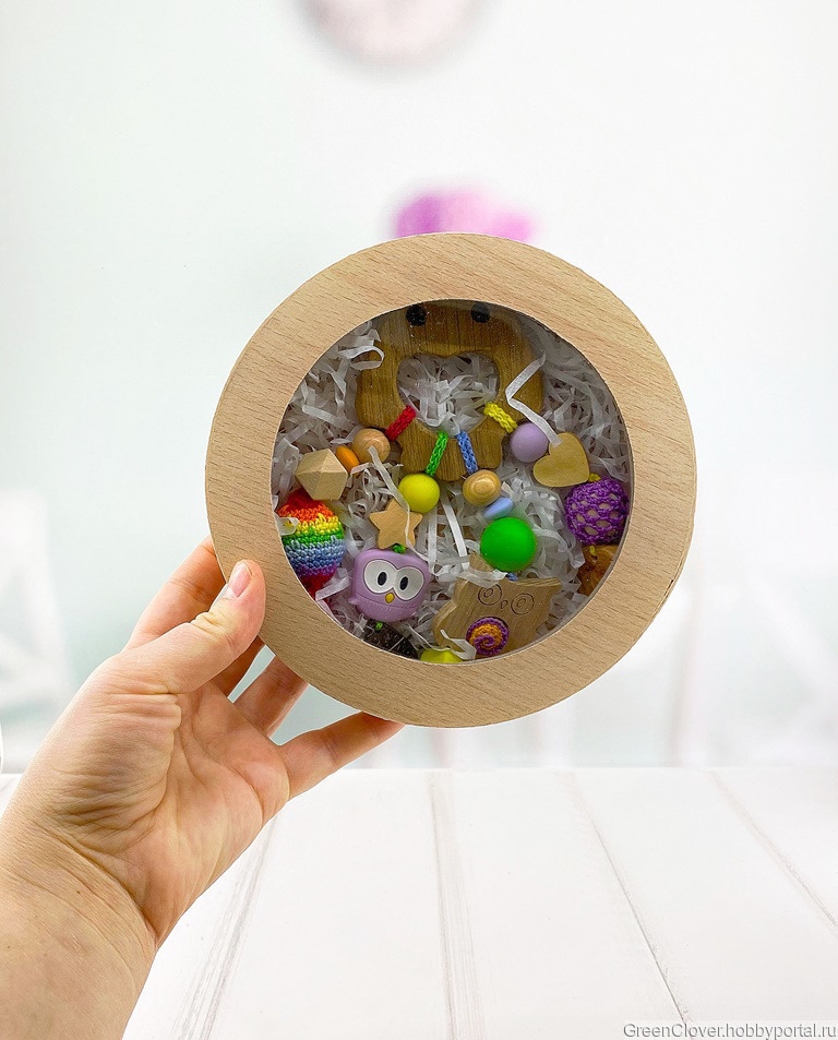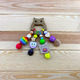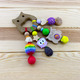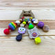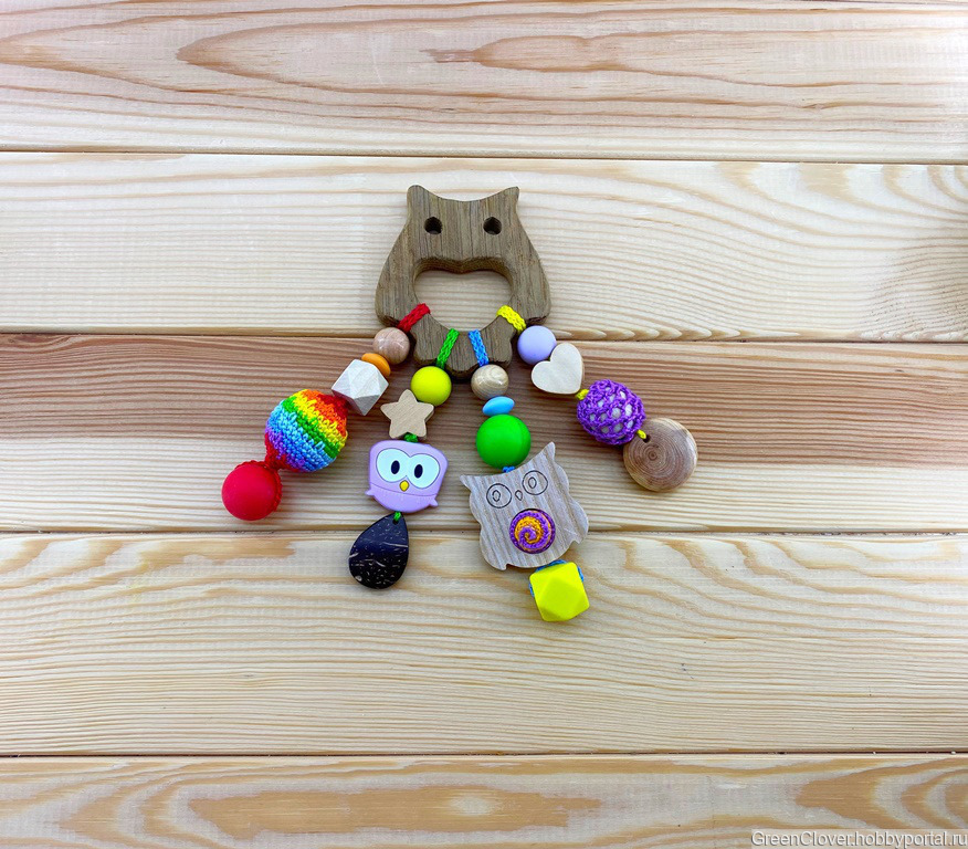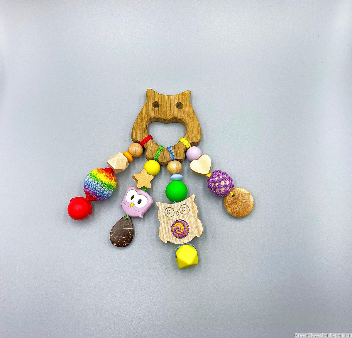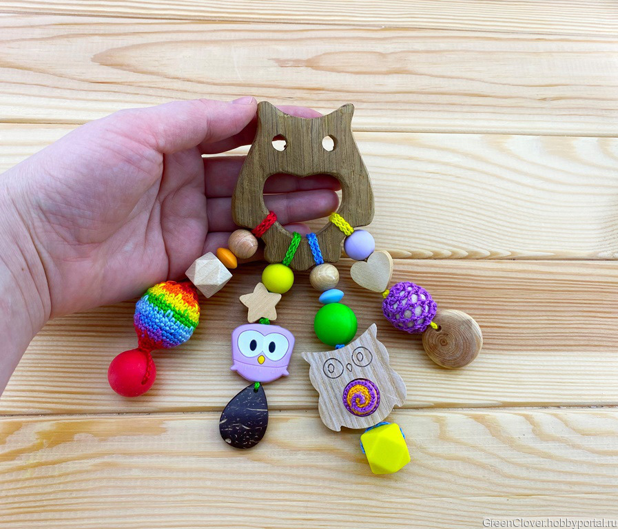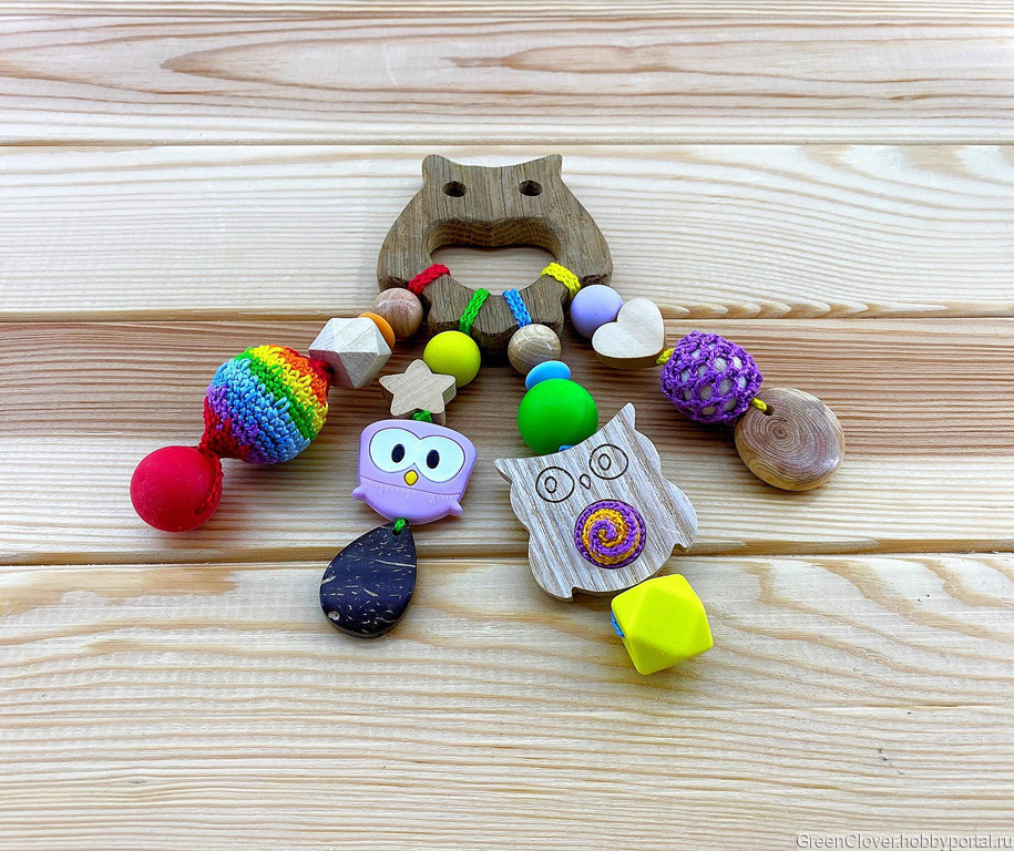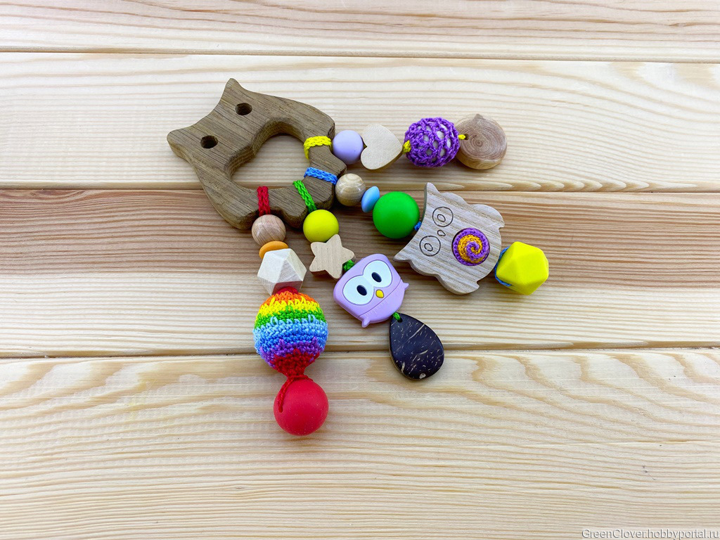 Прорезыватель дополнен можжевеловыми подвесками разных форм, бусинами, обвязанными качественным 100% хлопком, а также бусинами и фигурками из пищевого силикона.