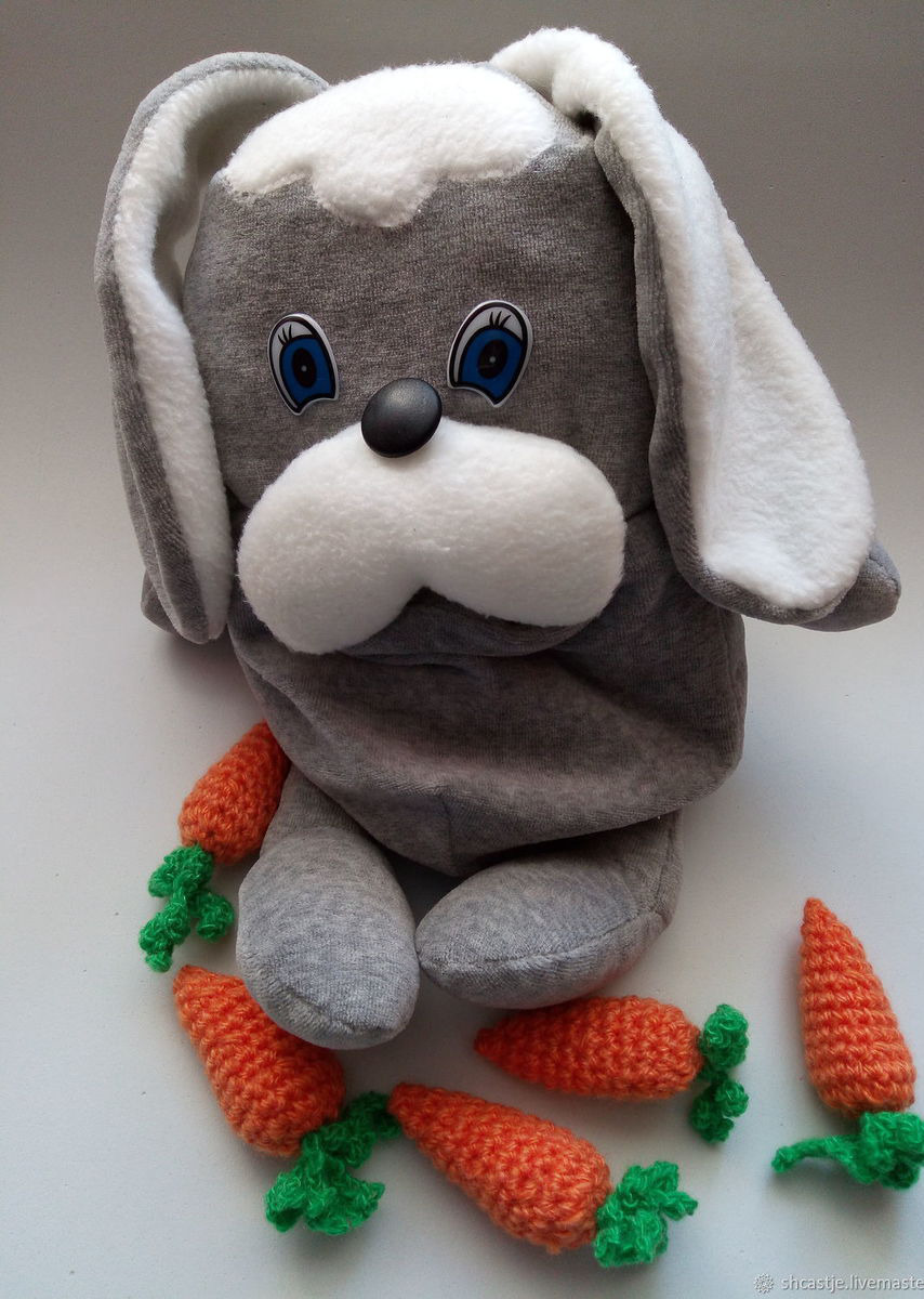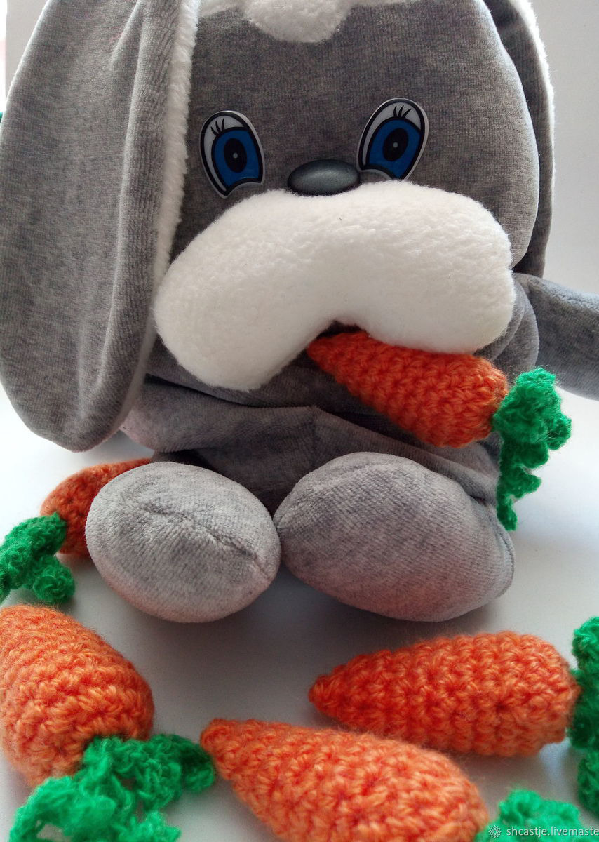 Заяц-проглот. Товарищ всеядный, любит морковку. высота тела зайца(без ушей и лап) около 25 см.длина ушек 20 см. Длина задних лап 12 см. Морковка ок. 8см длинной без ботвы. Морковок 10 шт. Изучаем счёт. Внутри морковок пакет, поэтому при сжимании немного "похрустывает". Все можно стирать (ручная стирка, или деликатно в машинке).