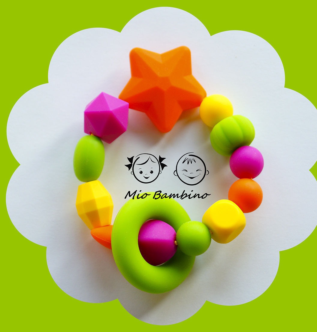У малыша режутся зубки? Как найти выход? Облегчить прорезывание зубиков поможет наш жевательный пончик-прорезыватель! Он сделан из безопасного пищевого силикона, имеющего сертификаты качества! Все бусины нанизаны на крепкий нейлоновый шнур, а не на резинку. Попробуйте потянуть пончик двумя руками в разные стороны - шнур выдержит! Благодаря ярким цветам пончик привлекает внимание малыша. Бусины разного размера и формы развивают мелкую моторику, а еще о них приятно почесать десенки. Силикон мягко пружинит при нажатии, по плотности похож на зефир или мармелад, но от него невозможно откусить кусочек! Специальное колечко на наших пончиках можно двигать в разные стороны, это очень интересно маленьким исследователям!