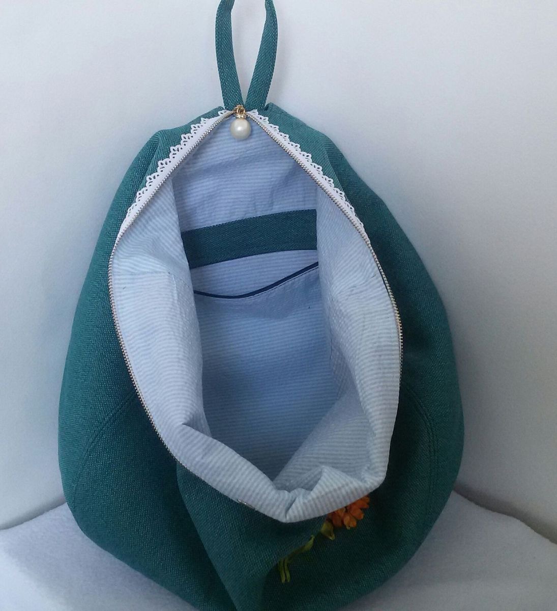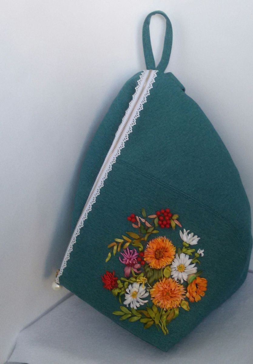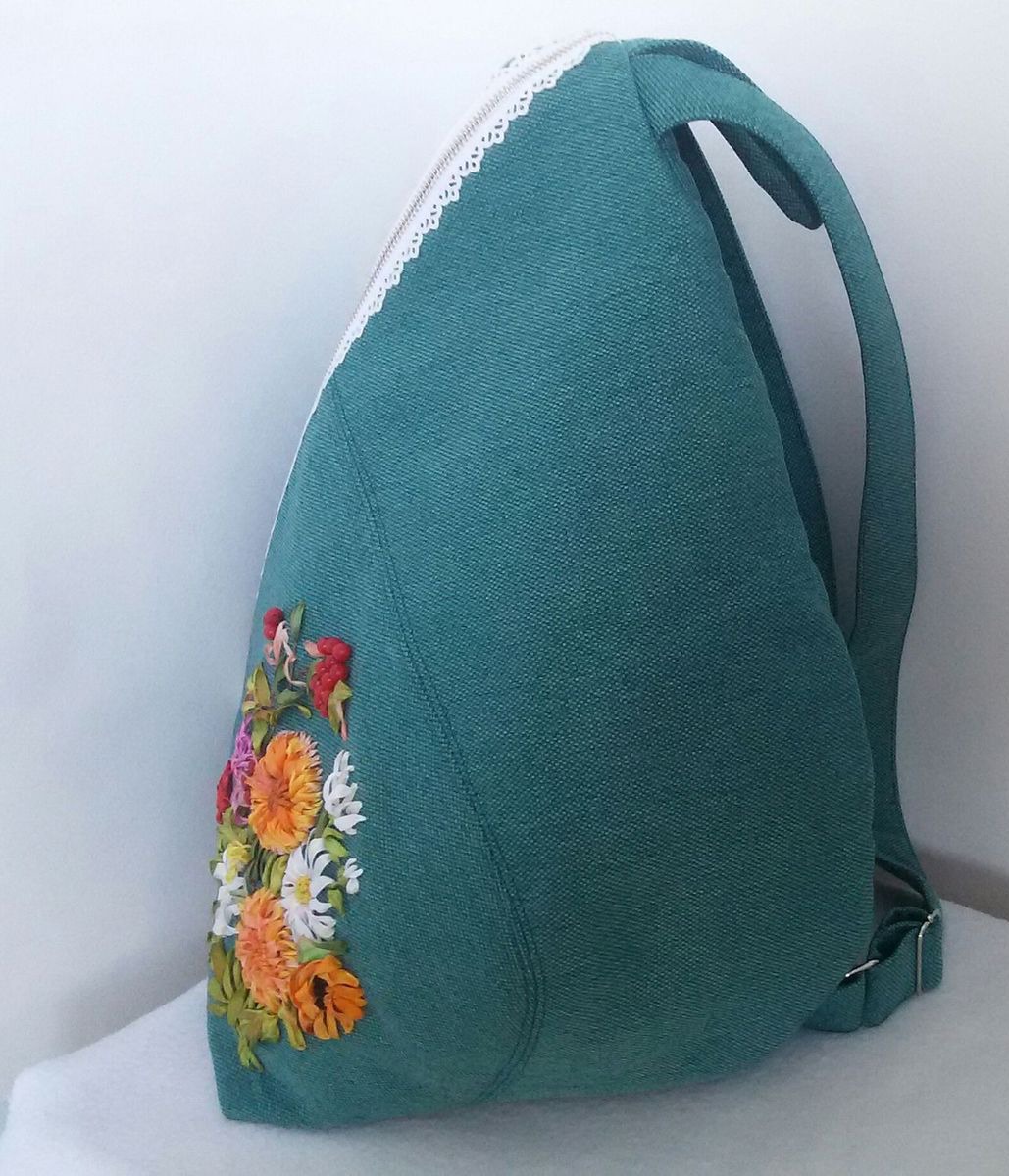 Рюкзак сшит в форме капли, украшен вышивкой