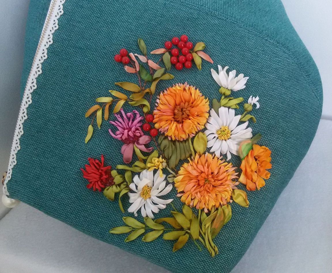 Вышивка летнего букета из подсолнухов Плюшевых мишек, ромашек, бергамота и ветки рябинки очень украшает и придает свою изюминку.