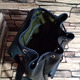 Верх рюкзака окантован полосой кожи и стягивается кожаным шнуром через металлические люверсы .