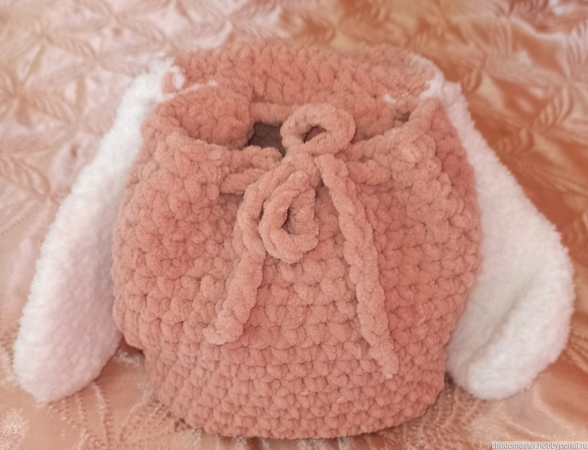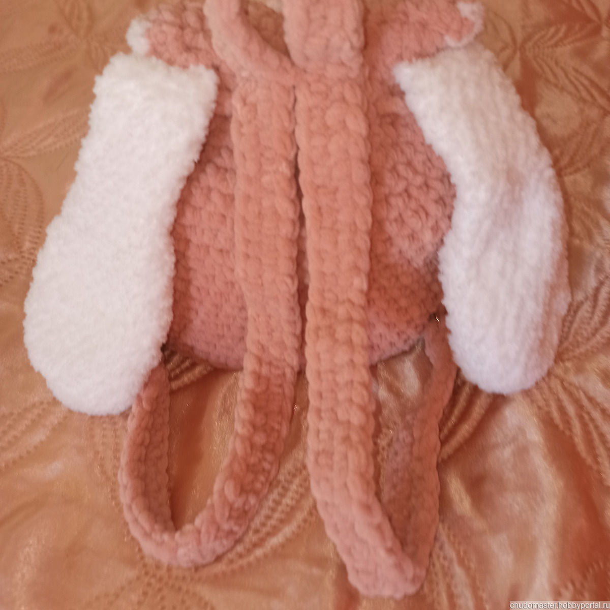 Вязаный детский рюкзак из плюшевой пряжи, ушки из микрополиэстера, без подклада, закрывается на магнитную кнопку, лямки не регулируются.Цвет - светлый персик.