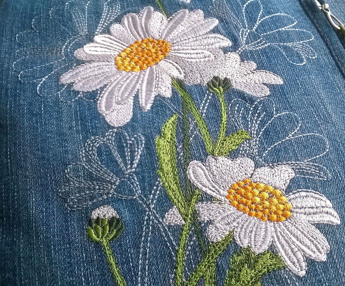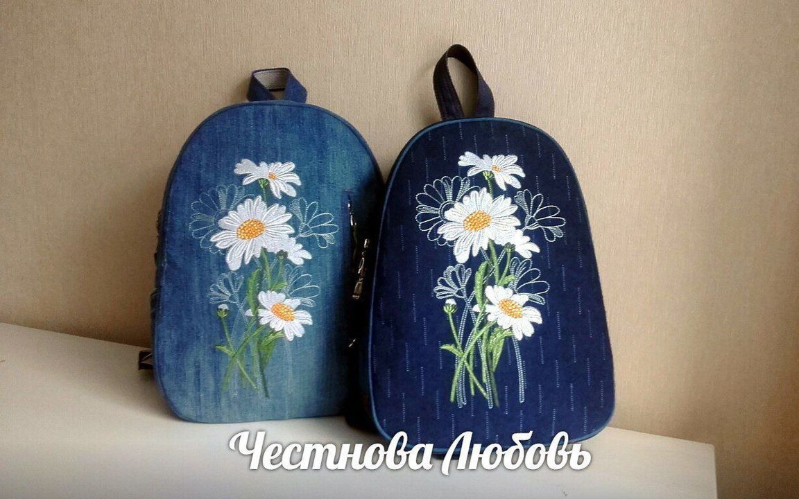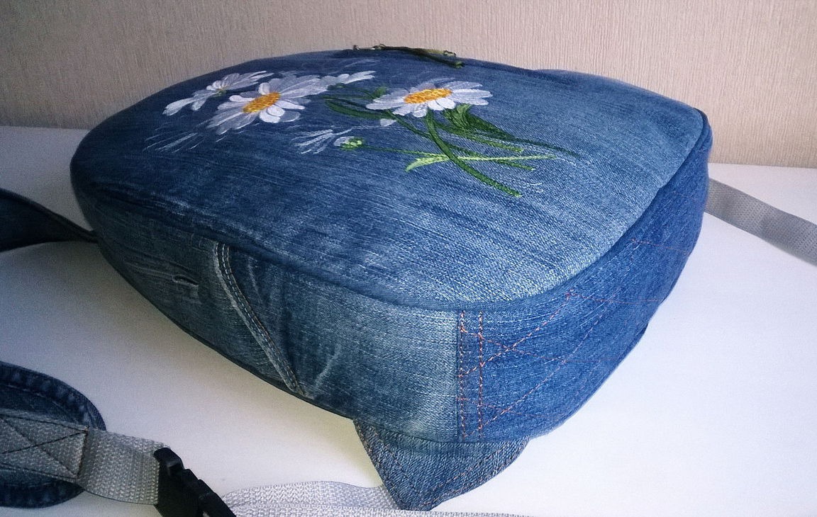 Романтичный джинсовый рюкзачок со скромным букетом из ромашек.