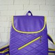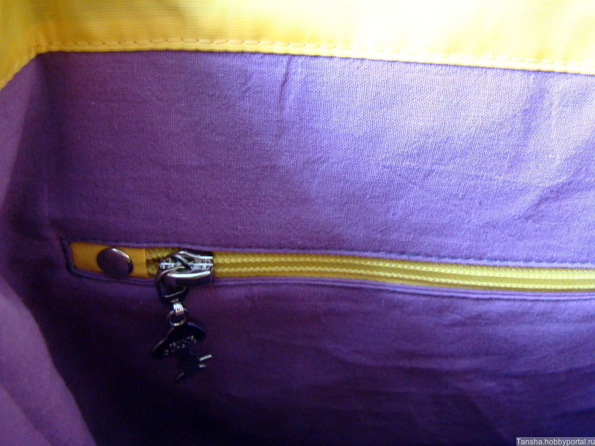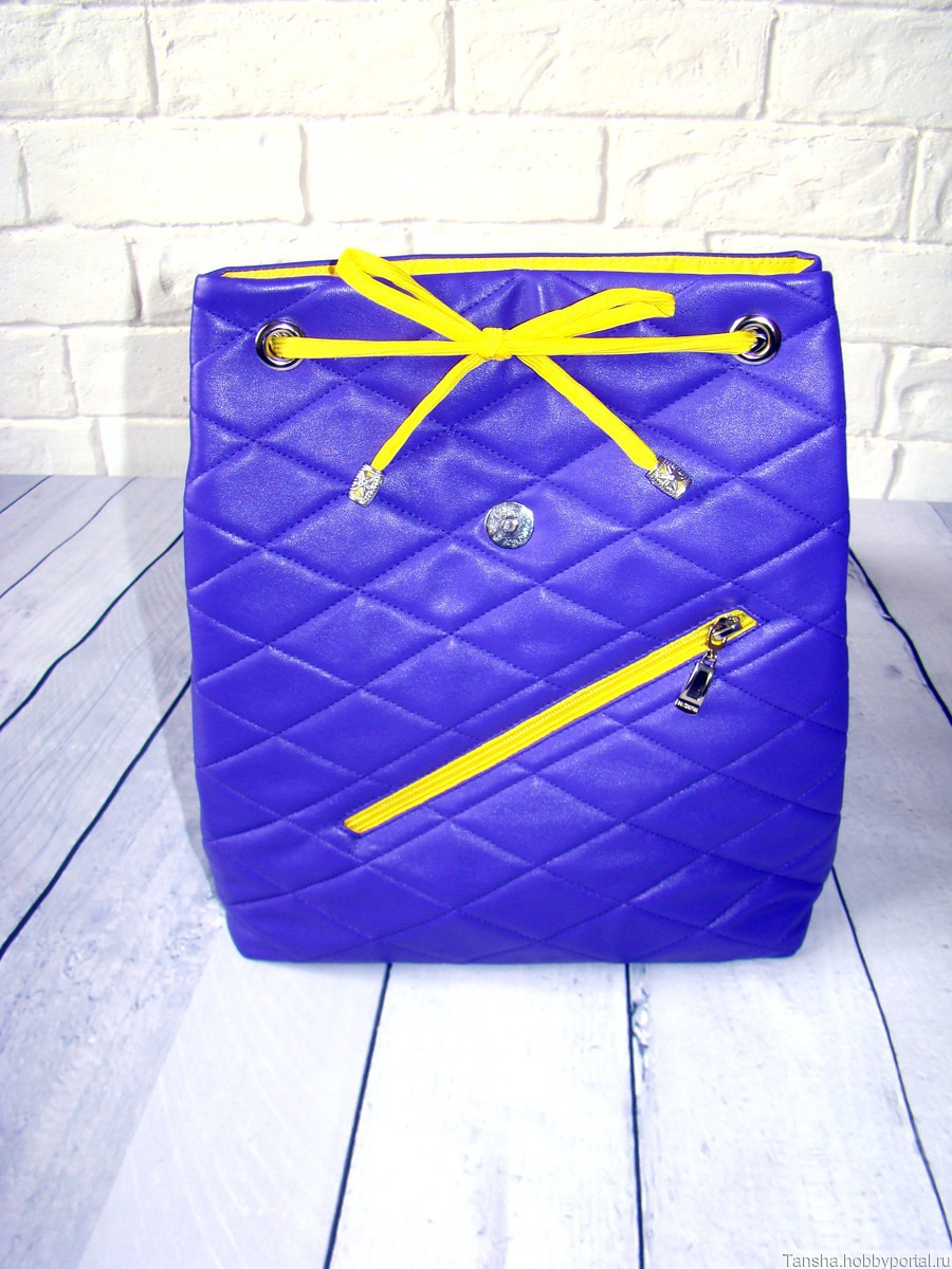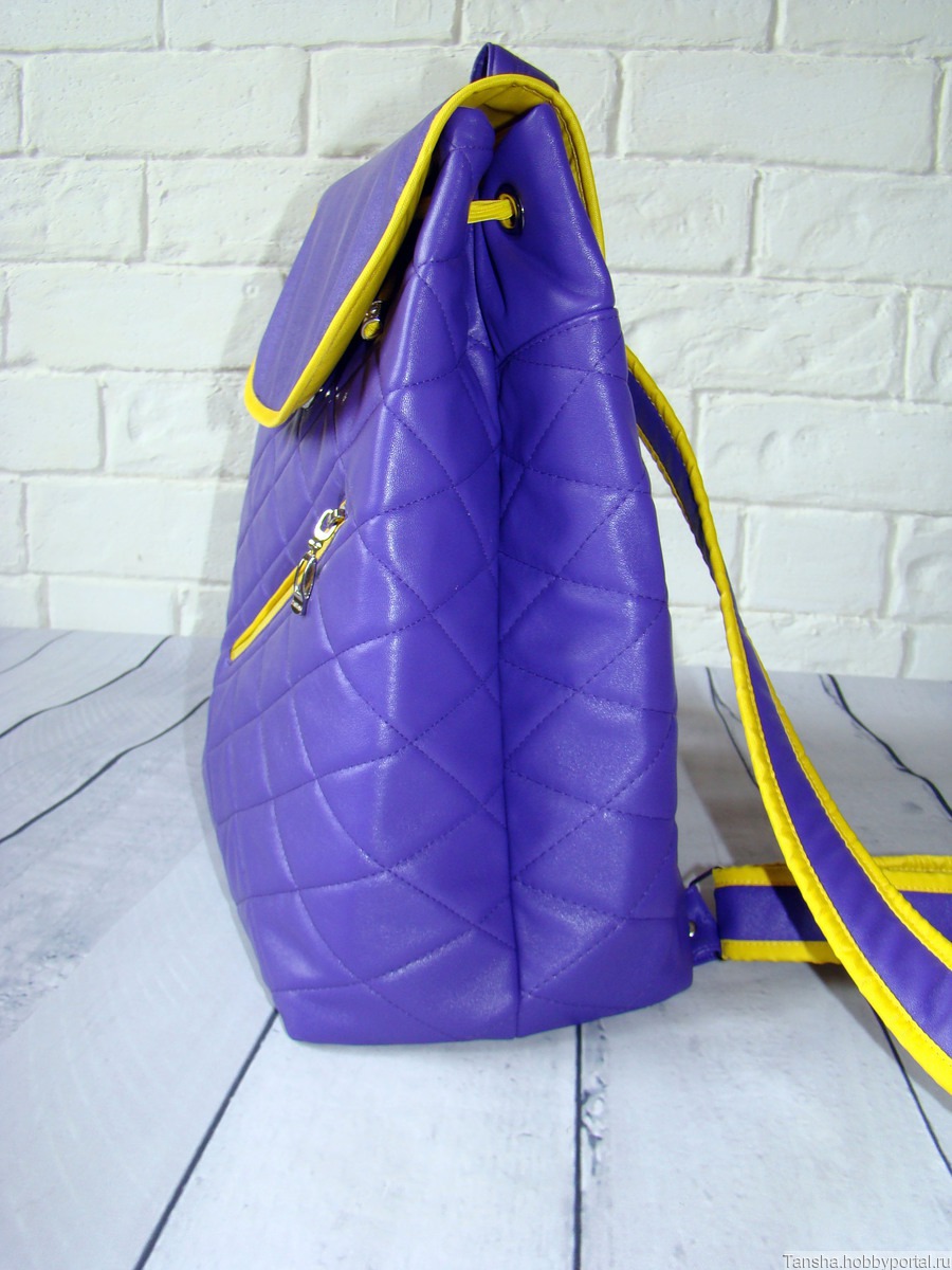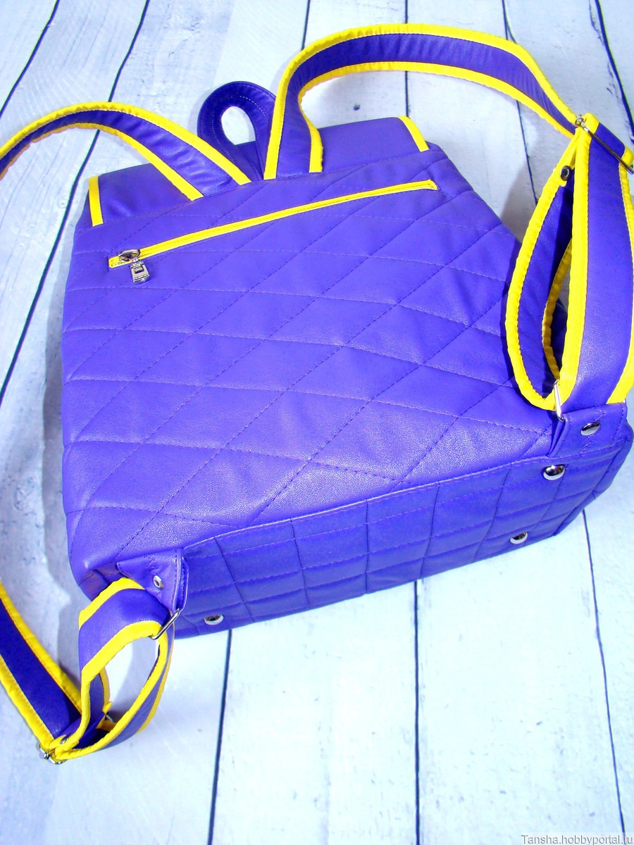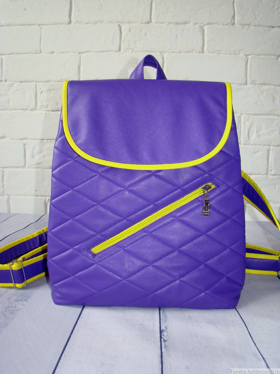 Женский рюкзачок фиолетовый, сшит из мягкой, приятной на ощупь экокожи, простёган, хорошо держит форму, отделка плащёвкой лимонного цвета, на передней половинке один карман на молнии, второй на спинке. Затягивается шнурком. Широкие мягкие лямки длинной 87 см, шириной 3 см регулируются. Хлопковый подклад сиреневого цвета, на подкладке два кармана, один открытый, второй на молнии.