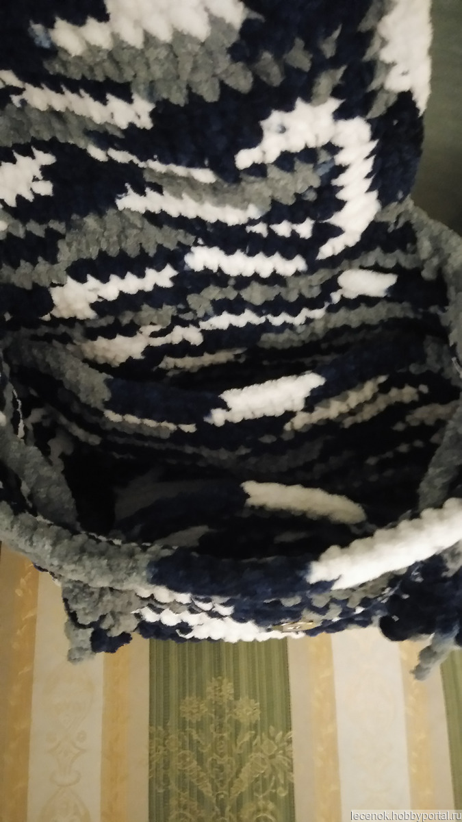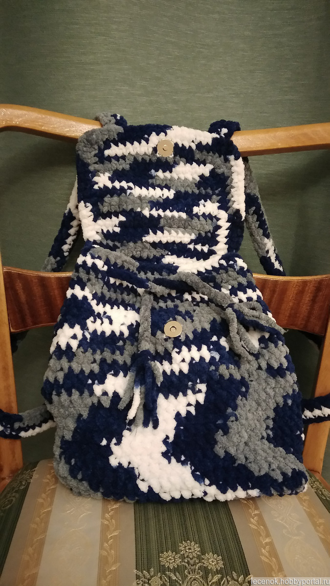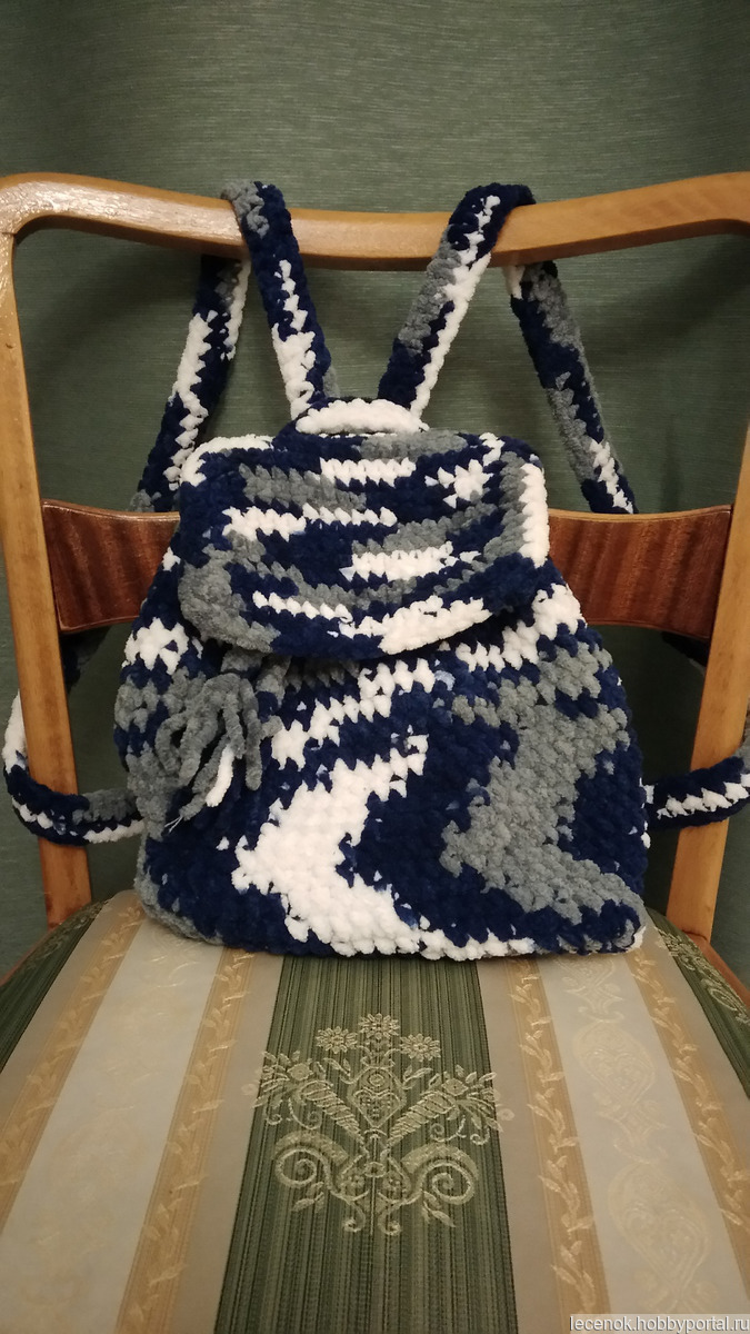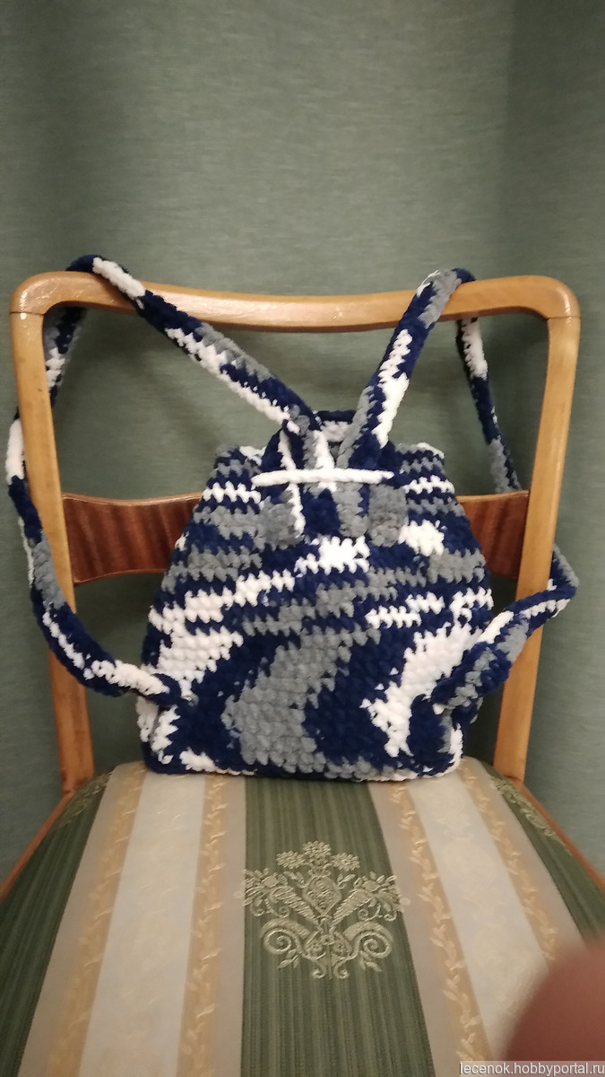Не пропустите, рюкзак ручной работы только в одном экземпляре. Я только для вас связала крючком мягенький, плюшевый рюкзак. Вы его сразу полюбите и он станет вашим любимым аксессуаром. Цветовая гамма рюкзака, сине-бело-серого цвета подойдет под многие ваши наряды. Впереди весна и лето, торопитесь приобрести эксклюзивную обновочку в свой гардероб.