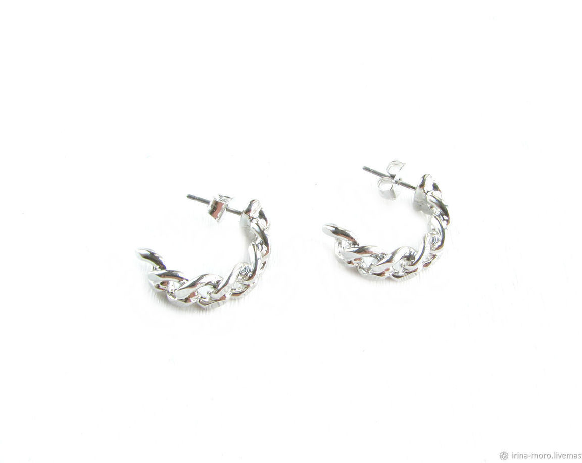 Модные, стильные серьги кольца цепочки. Длина сережек 2 см., ширина 0,6 см. Серьги выполнены из родиевой гипоаллергенной фурнитуры класса люкс.