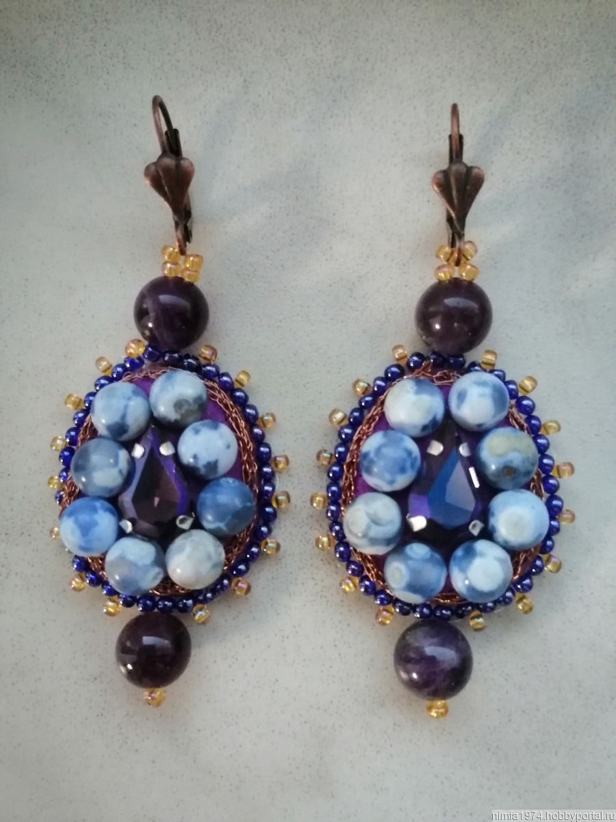 Мои новые серьги. Бусины натурального аметиста и бело-голубого агата, стразы стекло, металлическая цепочка, чешский бисер, швензы бронза. Думаю будут отлично сочетаться с брошью виноград. Получились яркие, стильные серьги. Авторские украшения ручной работы. Высылается в подарочном пакете из органзы.
