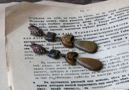 Длинные и легкие, слегка восточные, слегка асимметричные серьги из натуральных материалов в природных оливково-песочных оттенках. На латунных швензах под медь с английским замком.