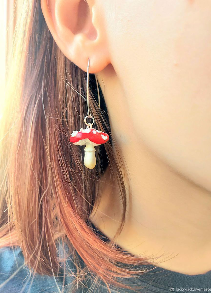 подарок девочке, подарок маме, длинные серьги, подарок подростку, грибочки, День смеха, мухоморы, украшения ручная работа, 1 апреля, поганки, подарое для девушки, природные украшения, серьги грибы, грибные серьги, грибные украшения, украшения полимерная глина, поганочка, лесной ведьме, грибочки серьги, смешные серьги, забавные украшения