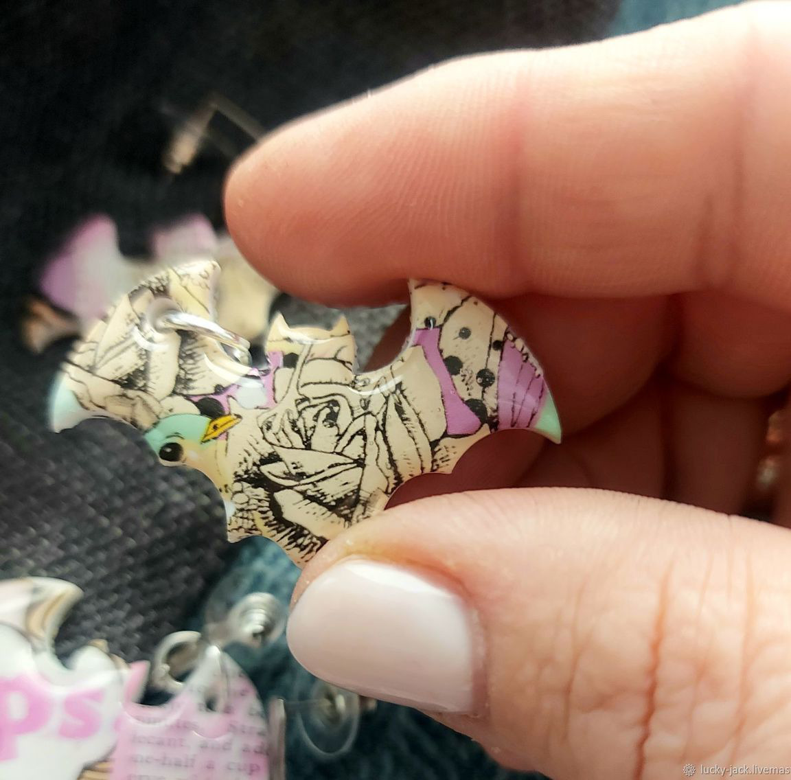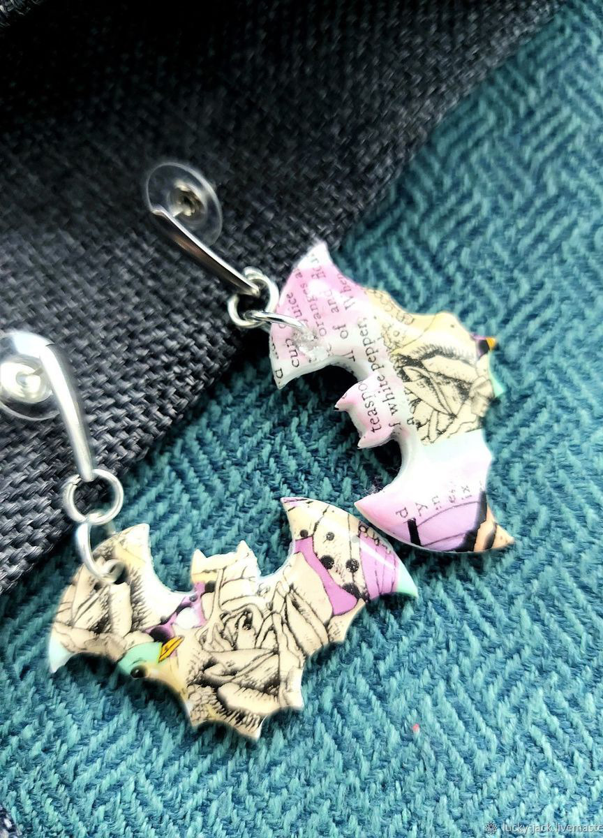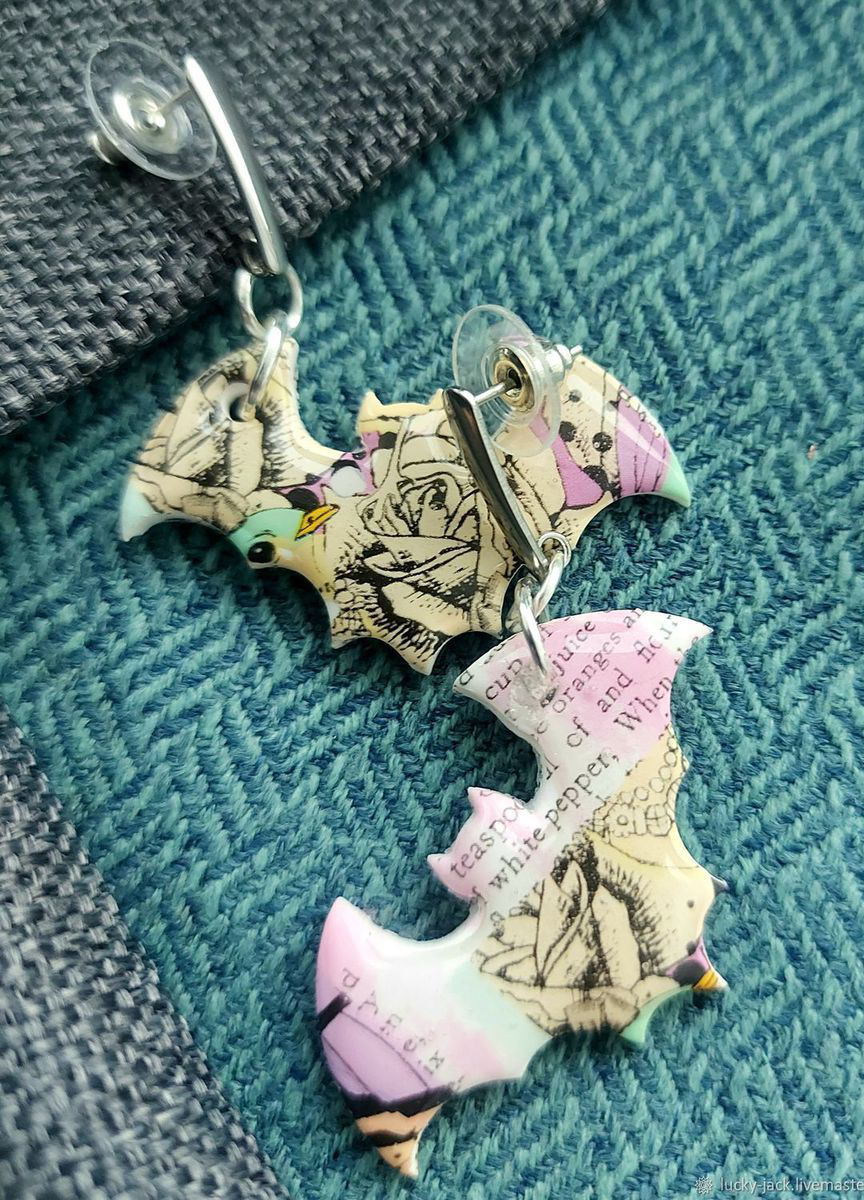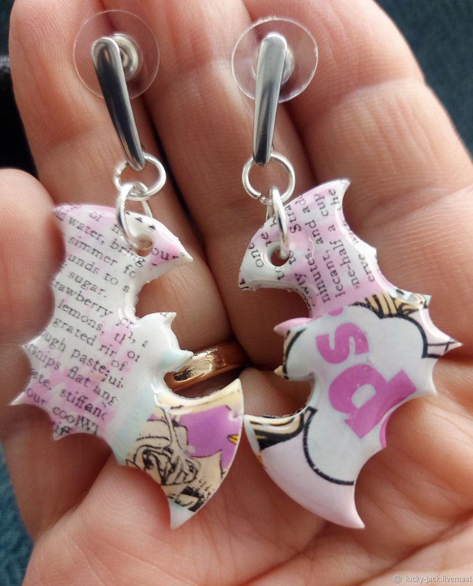 подарок на день рождения, подарок девушке, серьги-гвоздики, уникальный подарок, уникальное украшение, серьги ручной работы, длинные серьги, летучая мышь, сережки, комиксы, подарок на хэллоуин, авторская бижутерия купить, длинные сережки бижутерия, пастельный панк, украшения полимерная глина, серьги летучая мышь