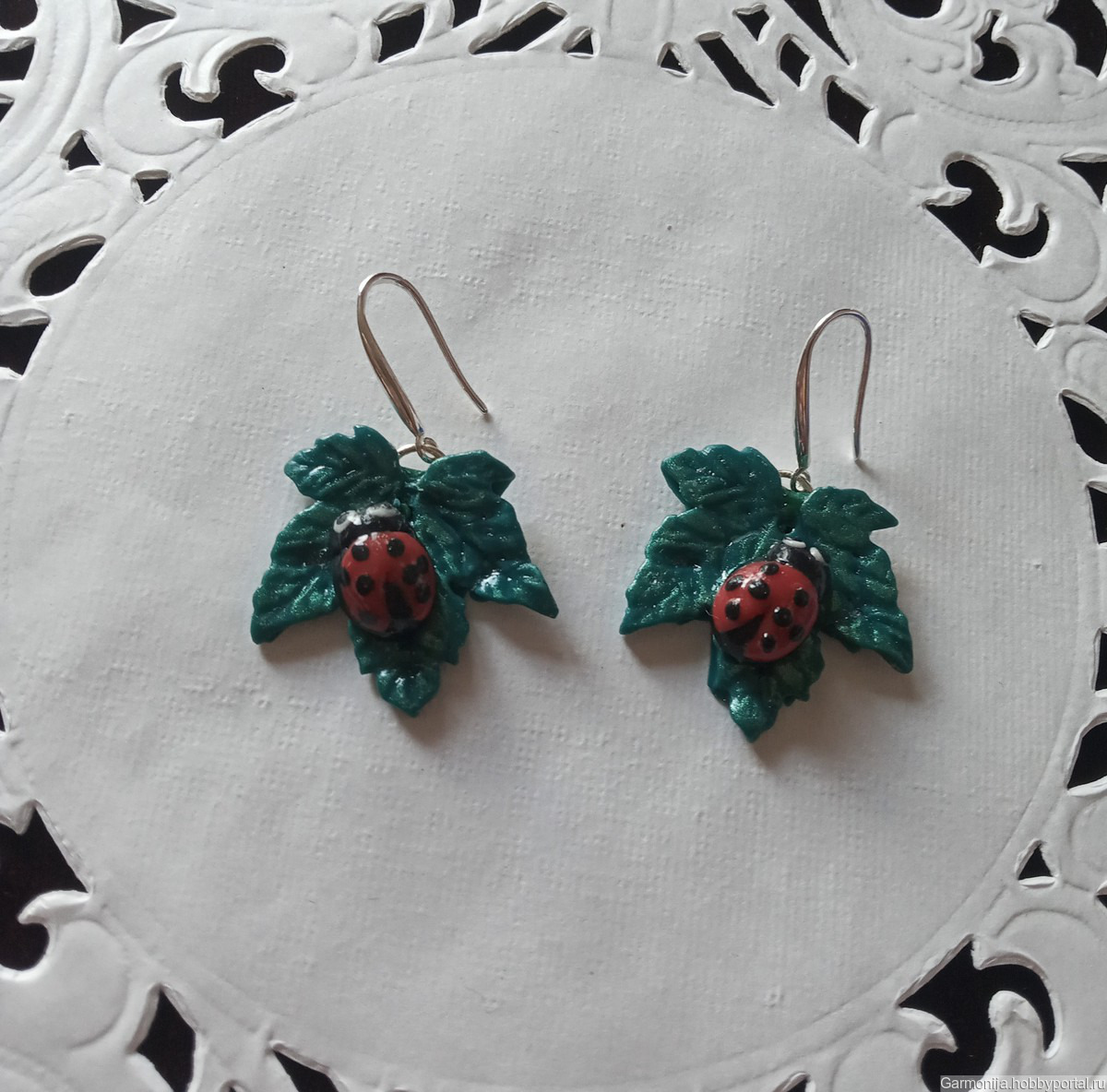Летние серьги из полимерной глины. Божья коровка деловито ползёт по зеленому листочку - значит наступило лето! Швензы - крючки из латуни с гальваническим покрытием серебром, гипоаллергенны.