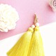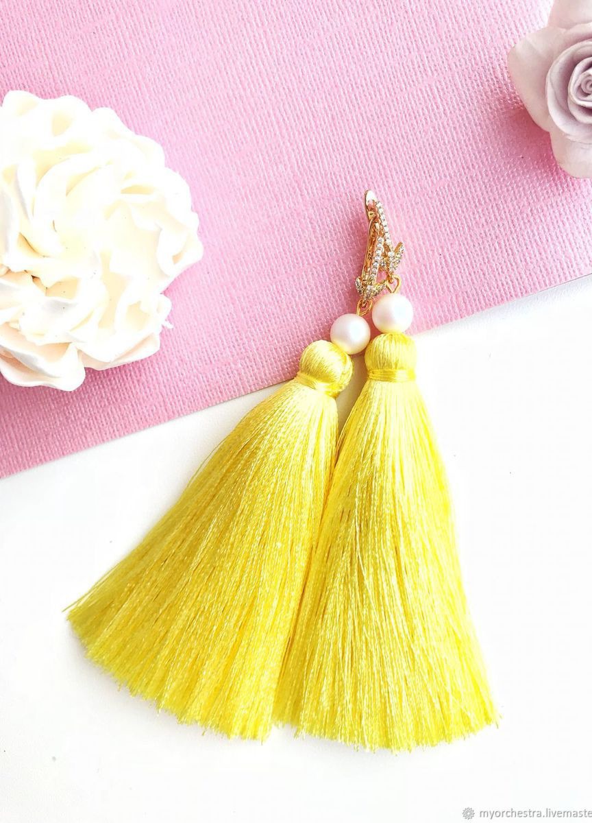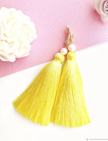 Яркие, сочные серьги кисти из шёлковой вискозы цвета лимонного суфле! Серьги практически невесомые, не оттягивают ушки. Дополнены жемчугом Swarovski, замочки с фианитамии гипоаллергенным покрытием позолотой, тип застежки - английский замок.