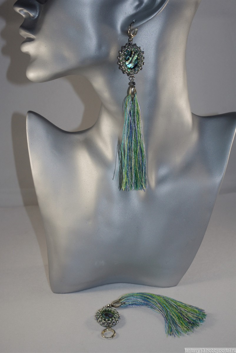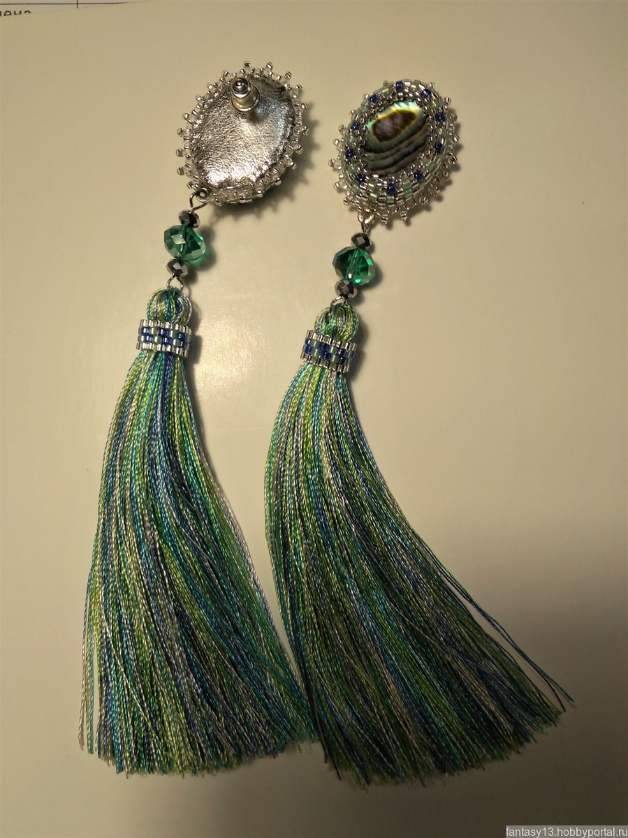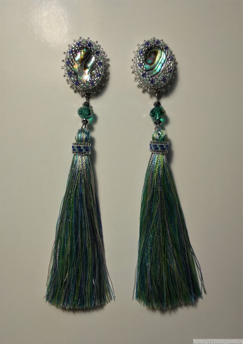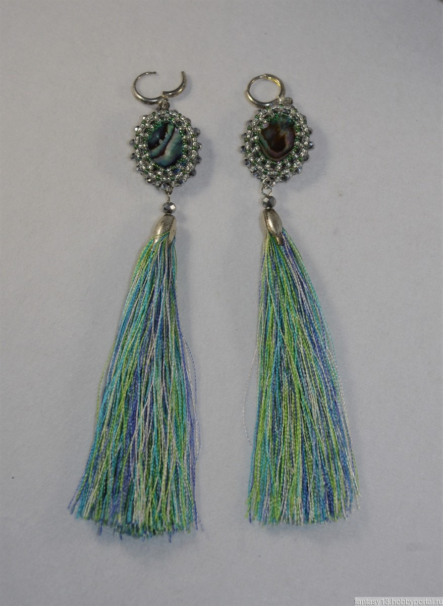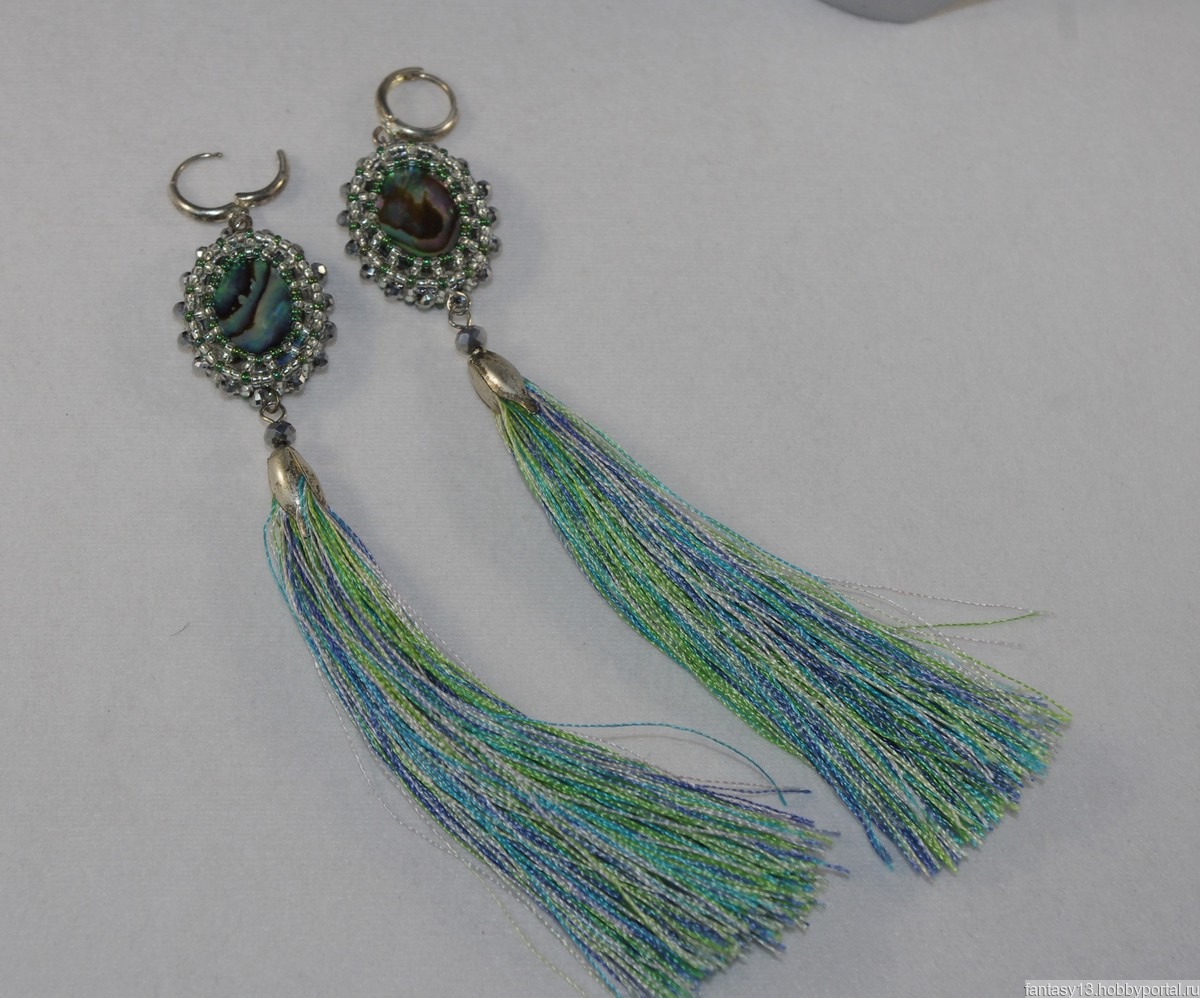 Оплетенные бусины пауа, японский бисер высокого качества, натуральная кожа, струящиеся кисти, итог - легкие изящные серьги "Наяда".