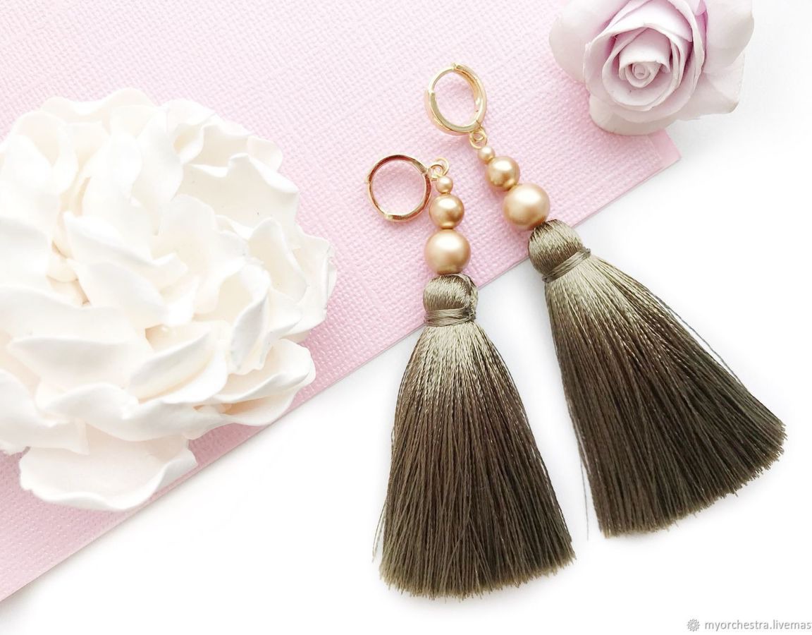 Маленькие оливковые серьги-кисточки из шёлковой вискозы с жемчугом Swarovski и гипоаллергенными позолоченными швензами-колечками восхитительно смотрятся с любым нарядом. Для тех, кто хочет носить серьги кисти, но не решается на длинные, это прекрасный вариант!