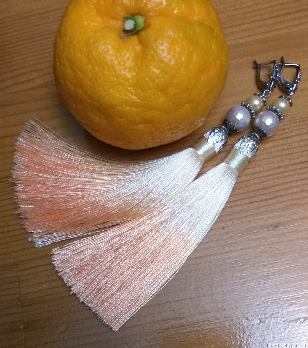 Серьги-кисти из шелка персикового цвета с переливом на бежевый, украшенные бусинами искусственного жемчуга. Этот прекрасный цвет как будто источает аромат свежих праздничных фруктов! Их хочется просто съесть, такие они милые и привлекательные!
