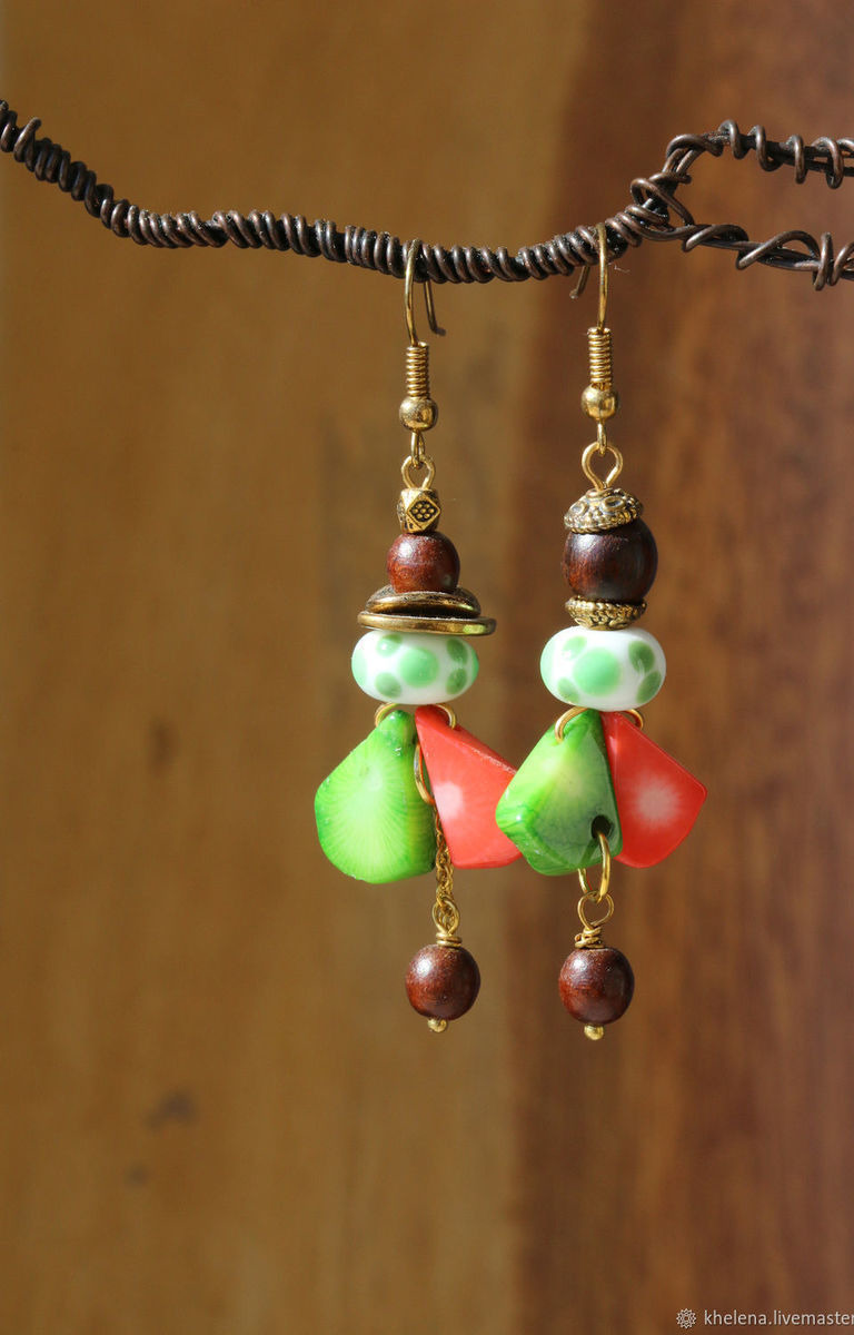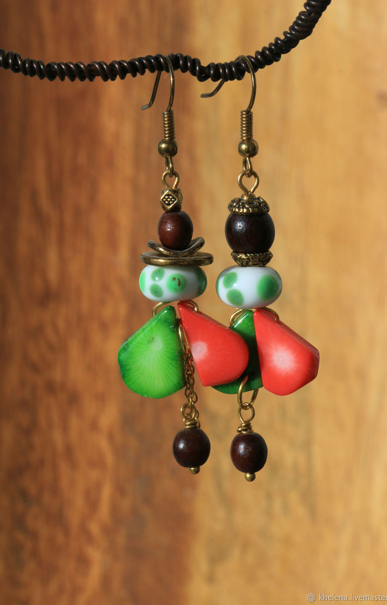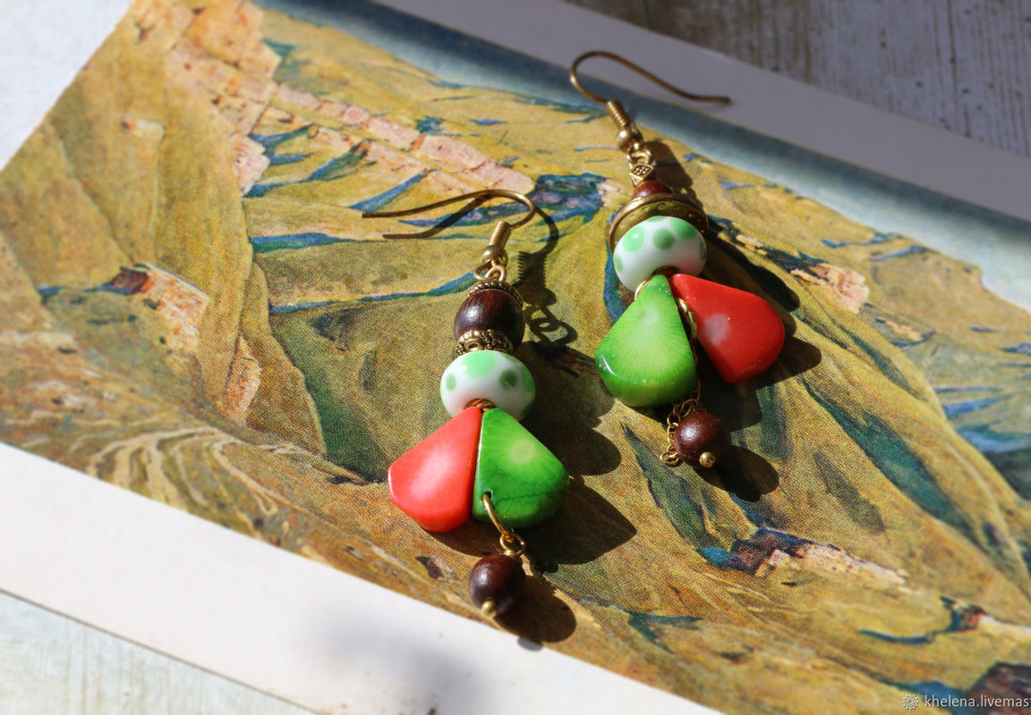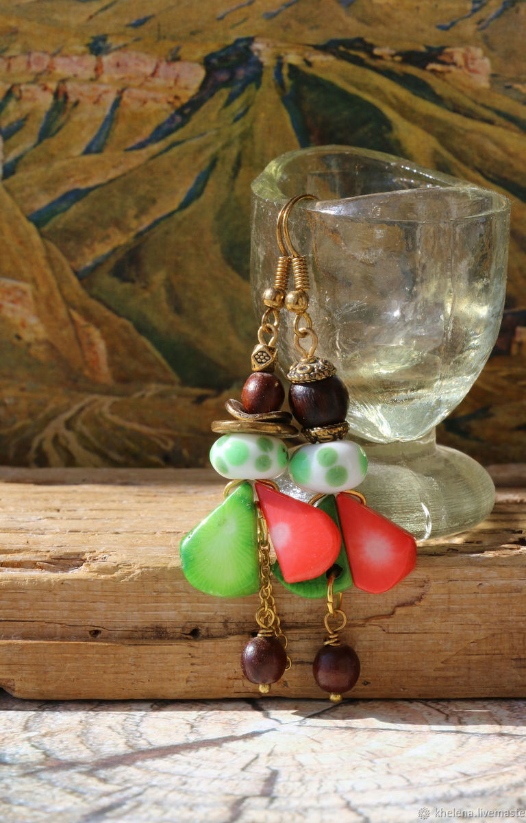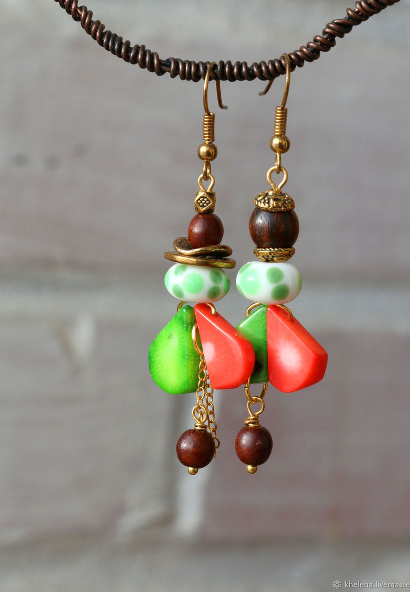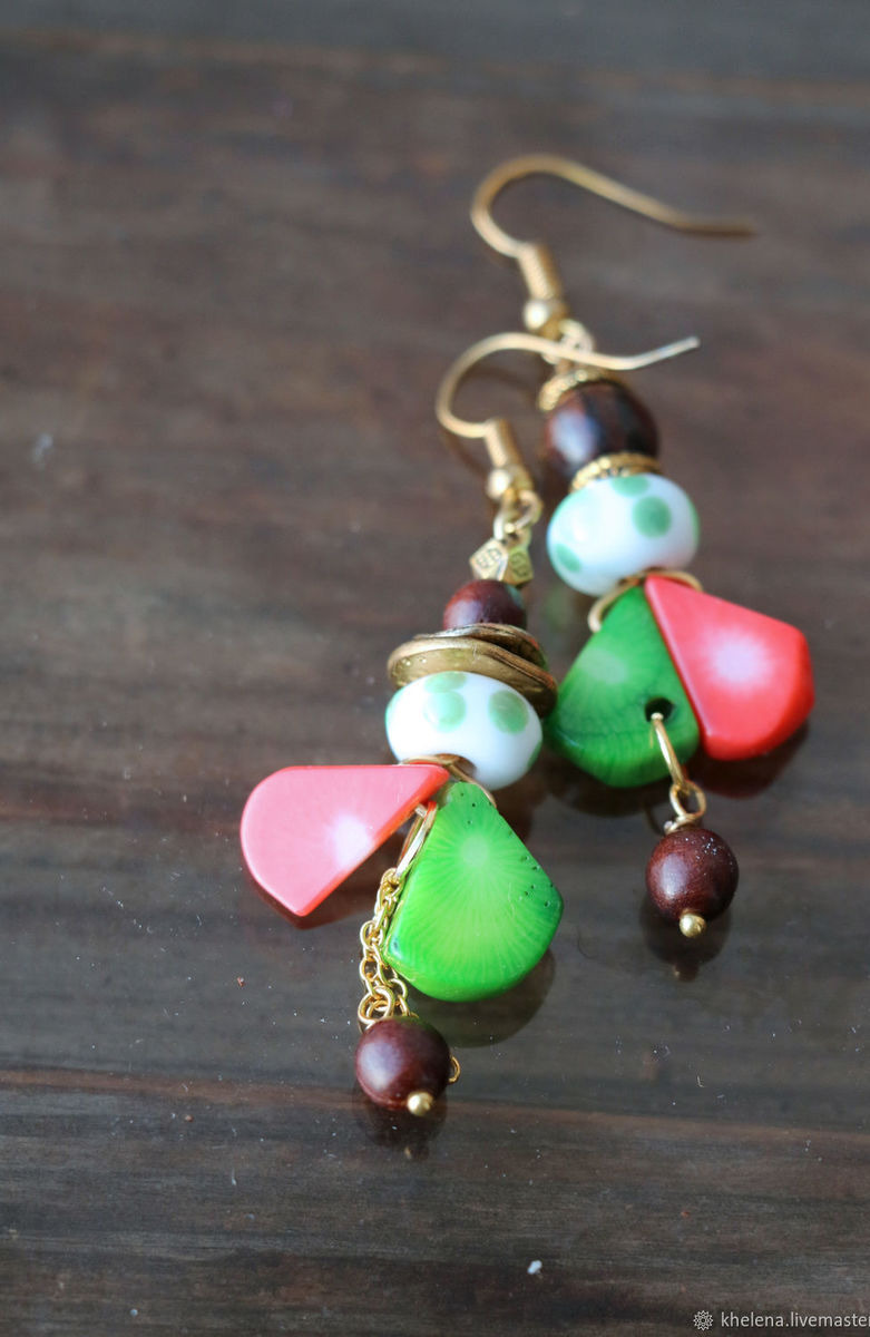 летние серьги, яркие сережки, серьги бохо купить, серьги из коралла и стекла, красно-зеленые серьги, сочные украшения, серьги для настроения, настроение лето, сережки в отпуск