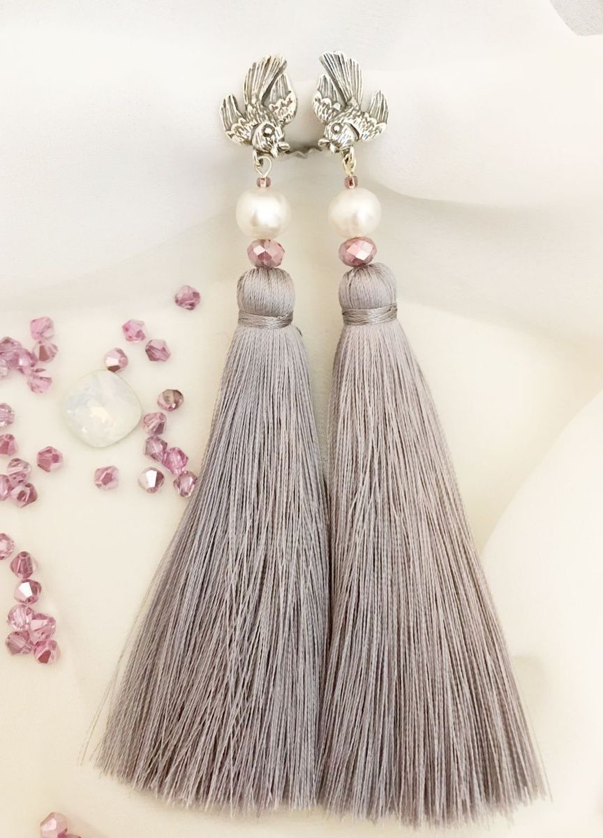 Необычные и очень нежные сережки в сочетании серого и розового с натуральным жемчугом станут вашими любимцами! Шелковистая немецкая вискоза отлично гармонирует с розовыми чешскими кристаллами и натуральными жемчужинами. Всю эту красоту, как бы паря в воздухе, несут две красивые птицы.