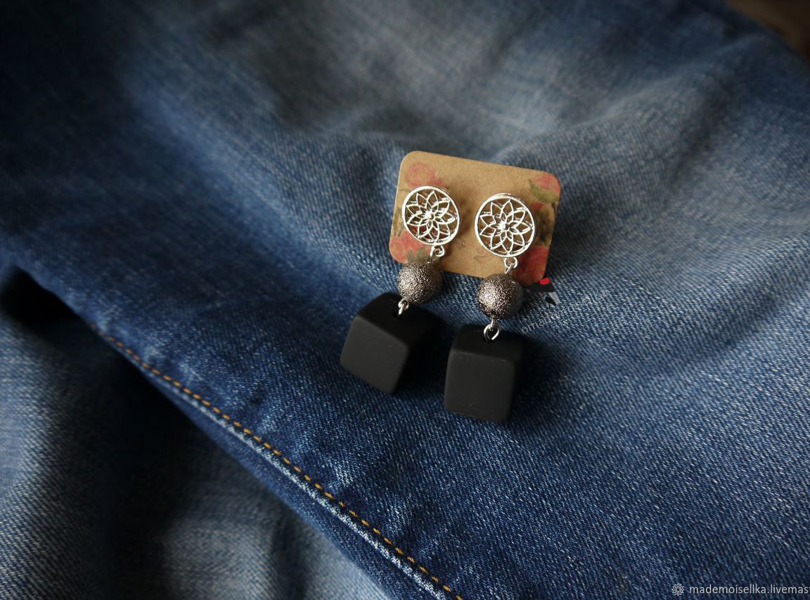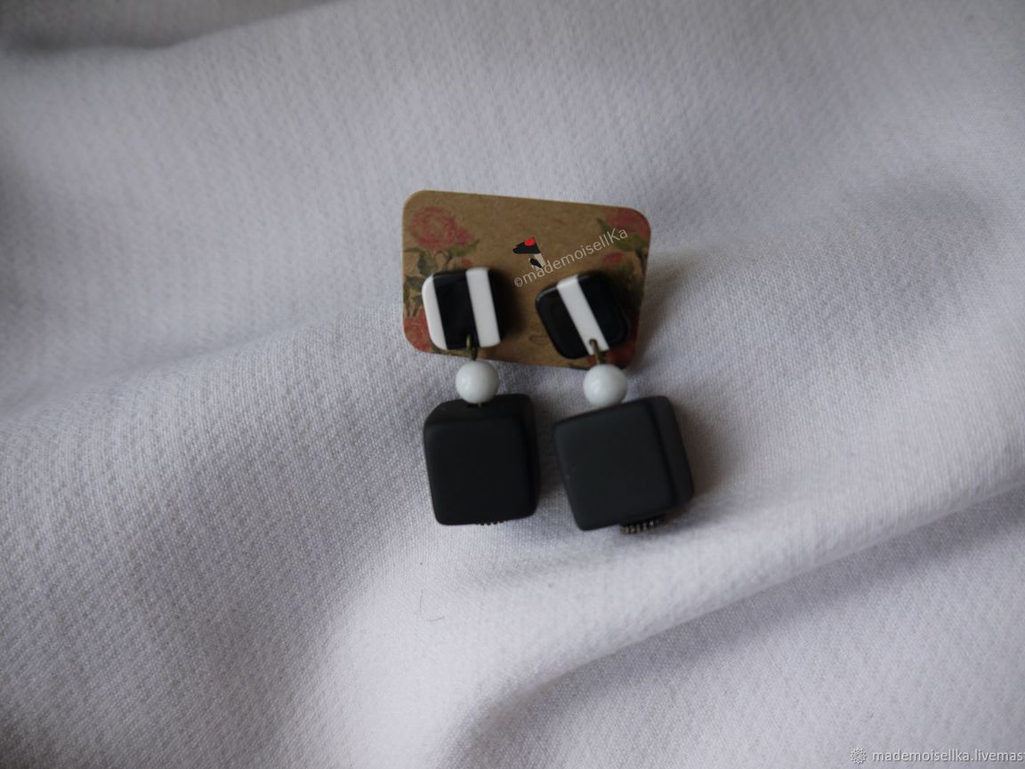 Размеры сережек: длина- 4 см, сторона квадрата- 13 мм.