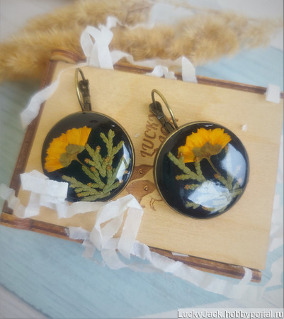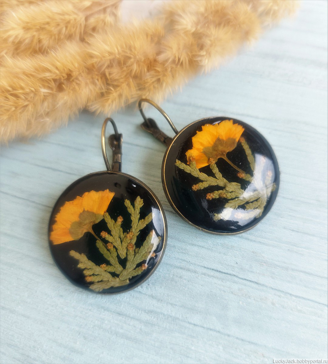 Серьги сделаны с настоящими цветами и травами на черной базе и финишным покрытием ювелирной эпоксидной смолой.