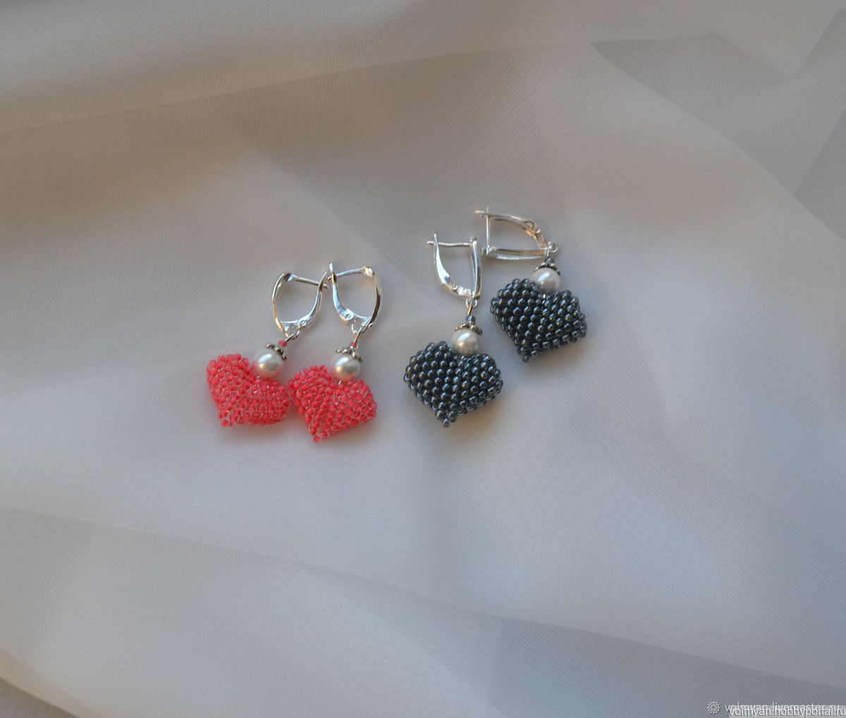 Серьги Сердечки выполнены из красивого чешского бисера и жемчужинок майорка.