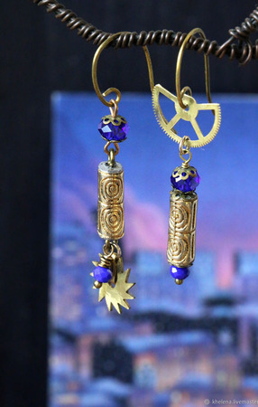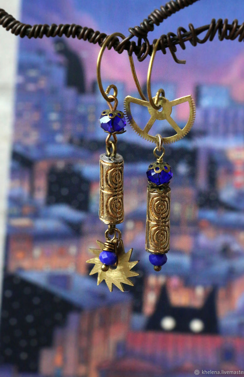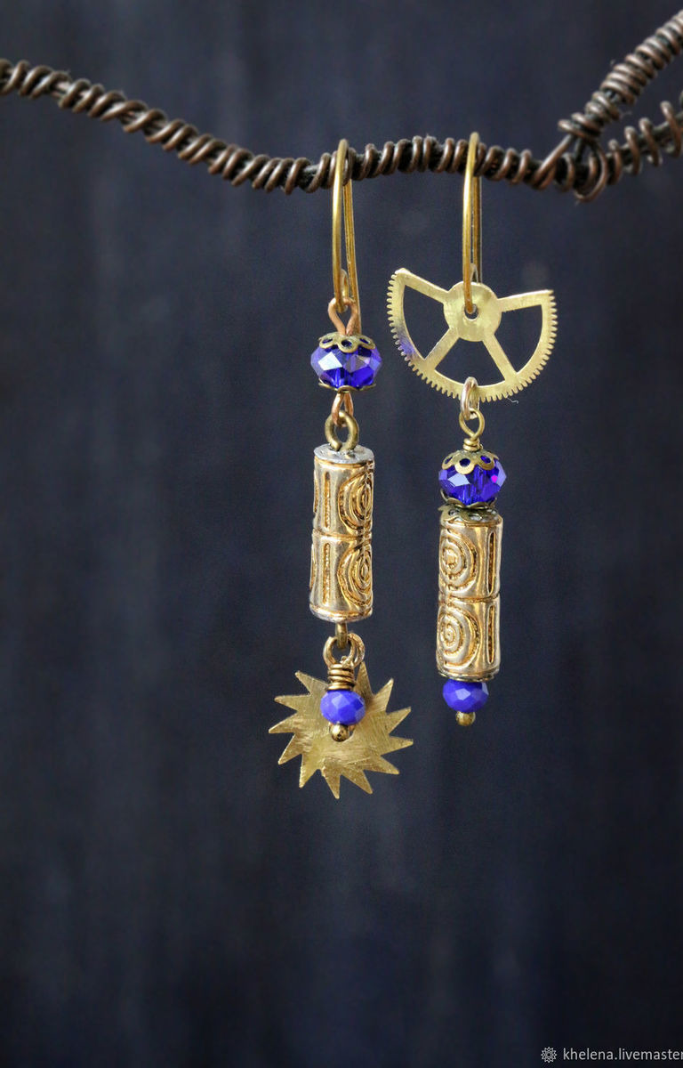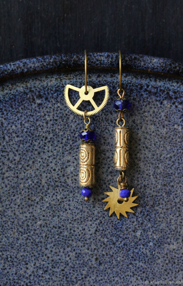 легкие сережки, серьги бохо купить, серьги в винтажном стиле, серьги с шестеренками, Ультрамариновое стекло, золотисто-синий, стиль ар-деко, египетские