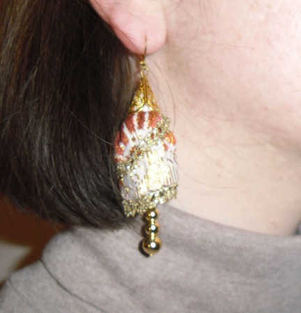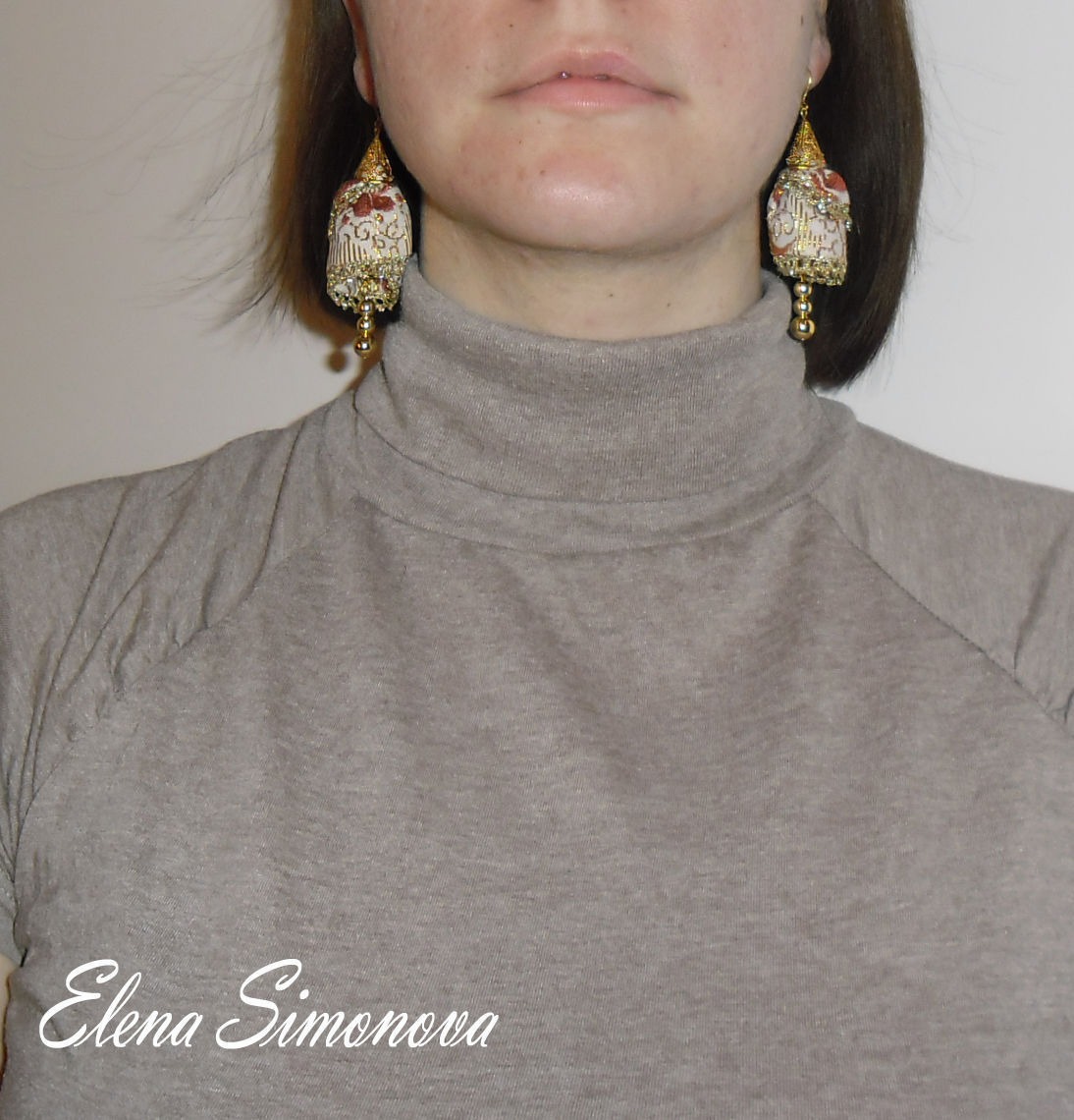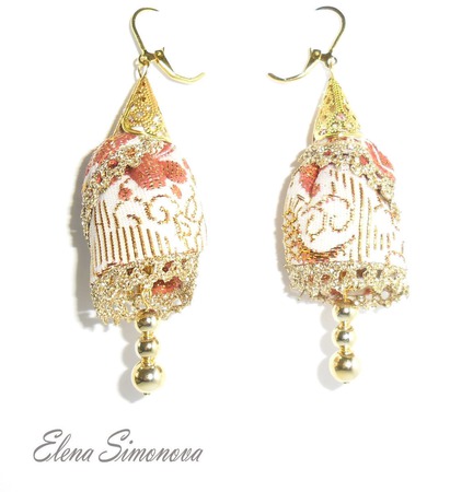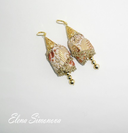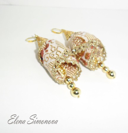 Серьги Золотая парча выполнены из парчи в виде колокольчика с цепочкой и бусинами внутри с использованием фурнитуры под золото.