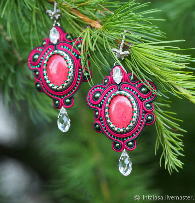 Сутажные серьги выполнены в традиционной для рождества зелено-красной гамме.