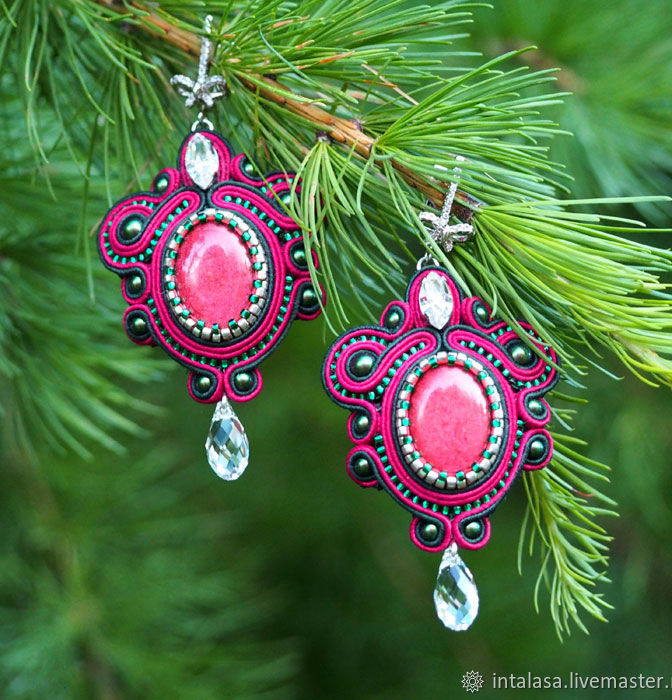 Центральные вставки - сделанные вручную акриловые кабошоны, остальное - кристаллы и жемчуг сваровски, японский бисер и сутаж.