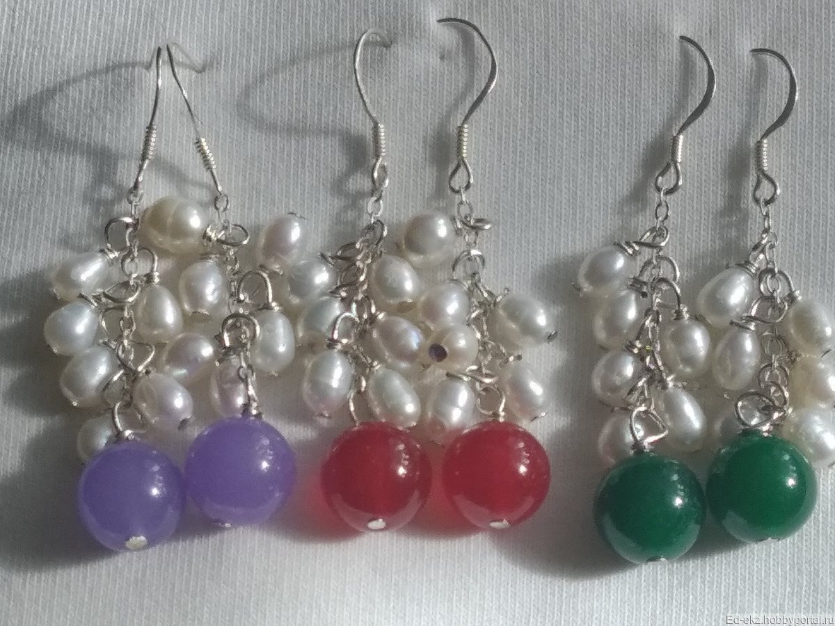 Мелкий речной жемчуг, цветной нефрит, фурнитура - ювелирный сплав.