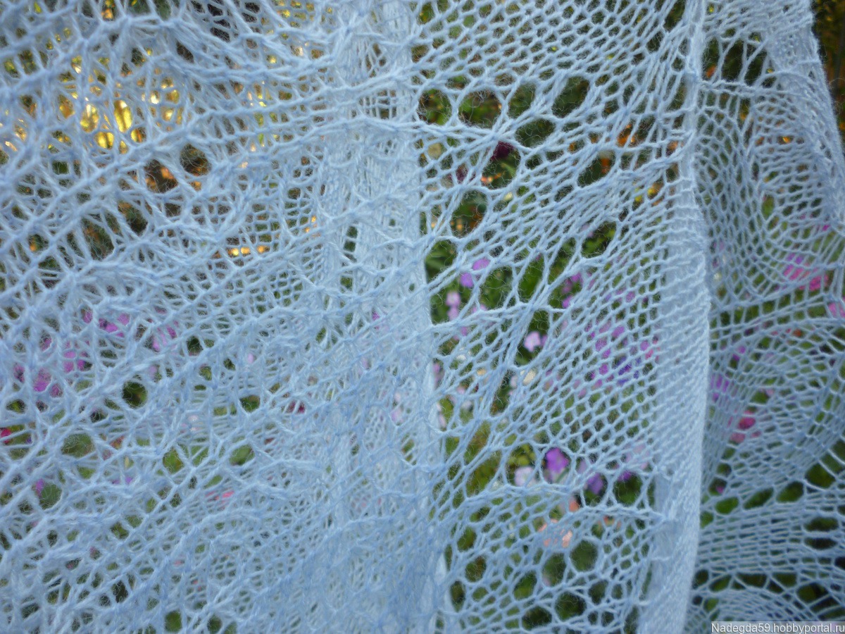 Шаль ручной работы ,связана на спицах из очень мягкой полушерстяной пряжи турецкого производства "Ализе " Цвет шали светло -голубой .
