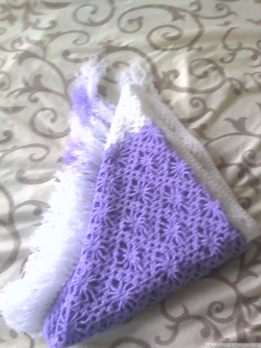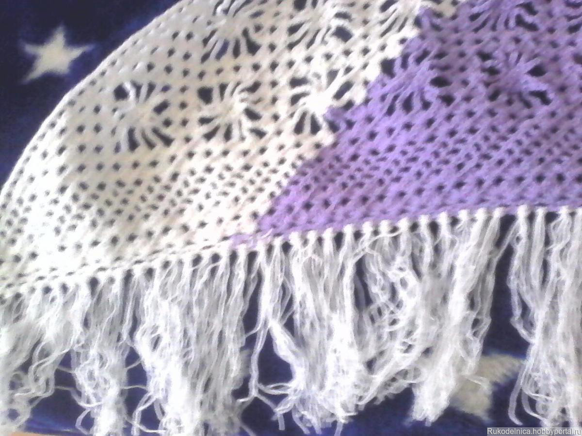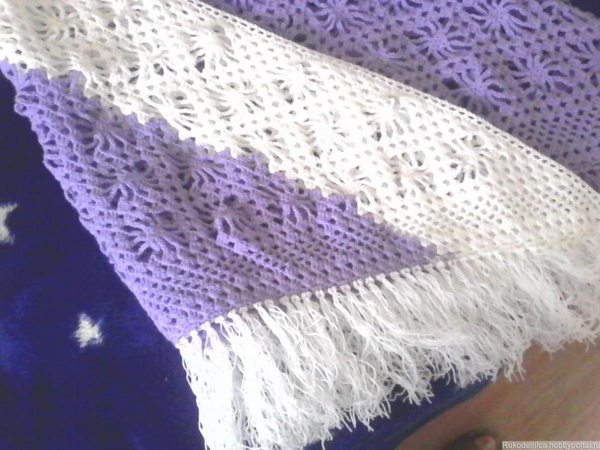 Шаль выполнена крючком в технике исполнения паучки, двухцветная, использована акриловая пряжа фиолетового цвета (ближе к светло сиреневому) и ангора белого цвета, воздушная, ажурная, нарядная, нежная, с бахромой. Работа ручная. Изделие готово. Могу выполнять работы под заказ.