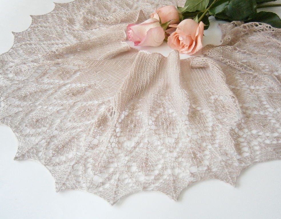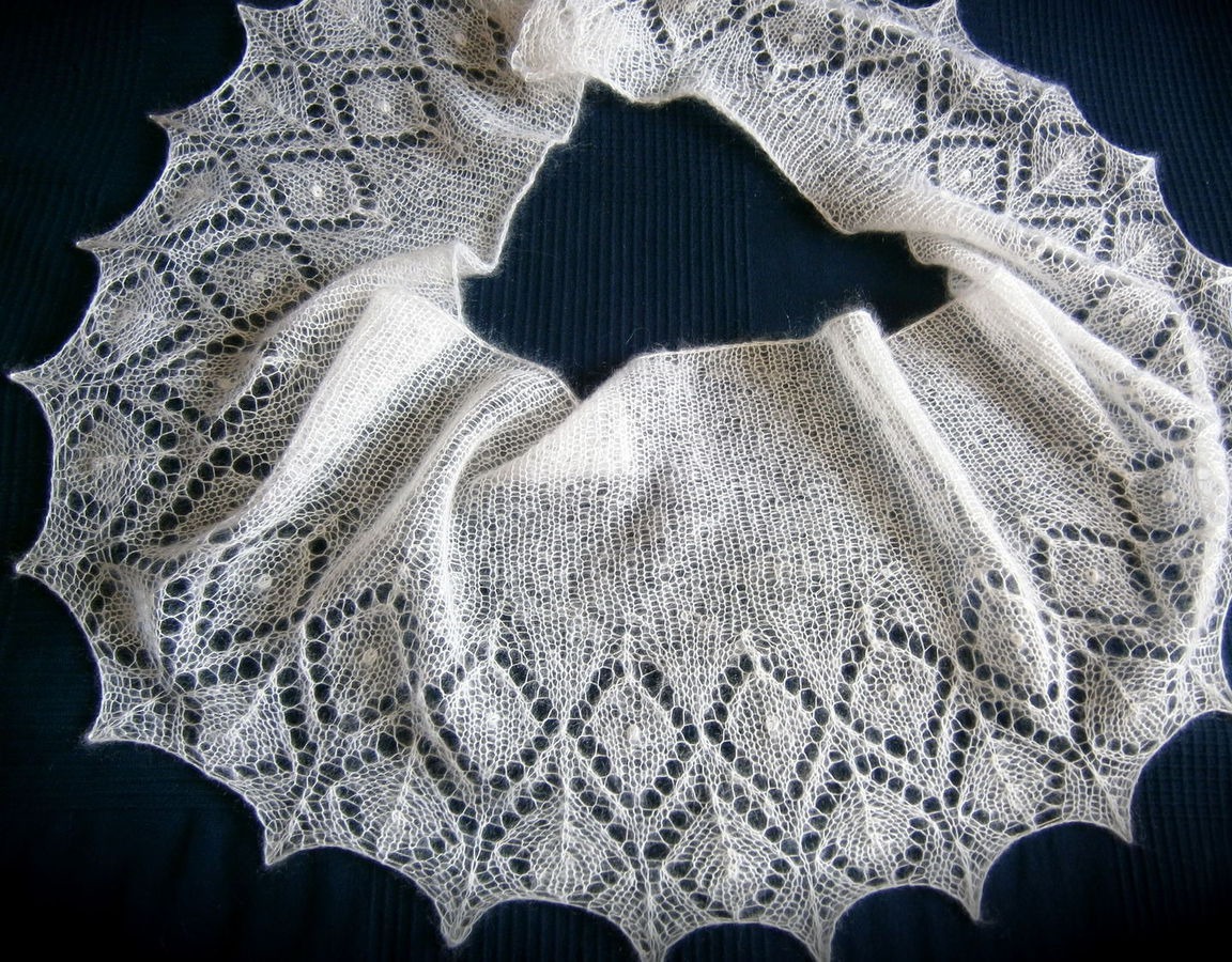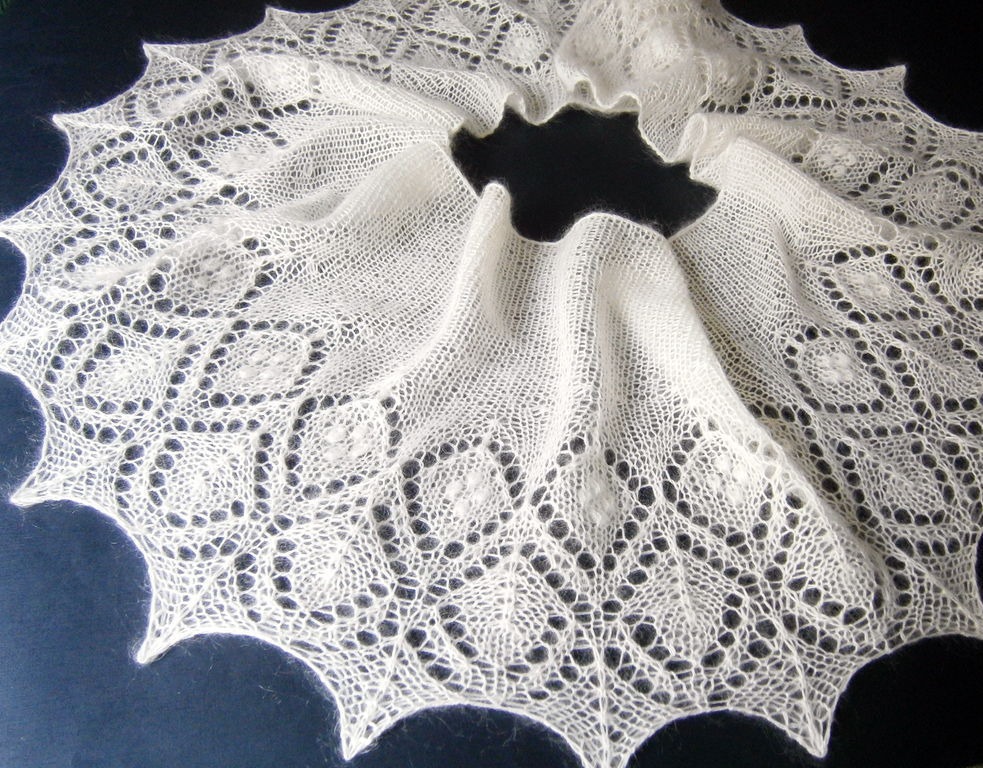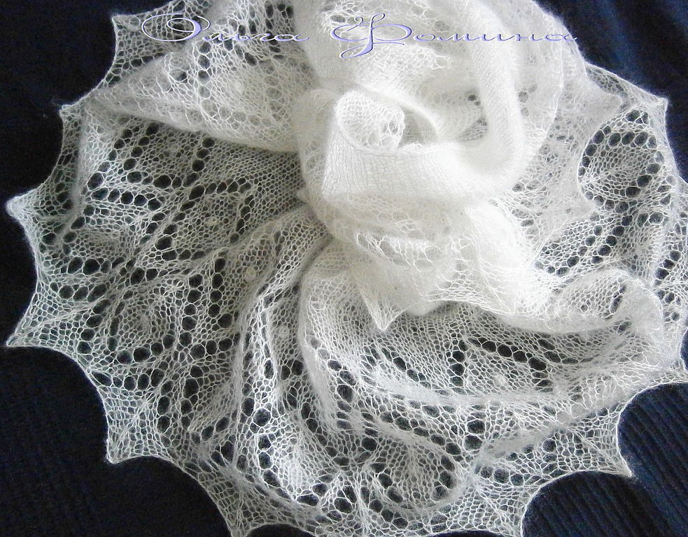 Легкая и нежная, эта мини-шаль связана из итальянского супер кидмохера. Вес шали всего около 40 грамм. Шаль связана спицами.